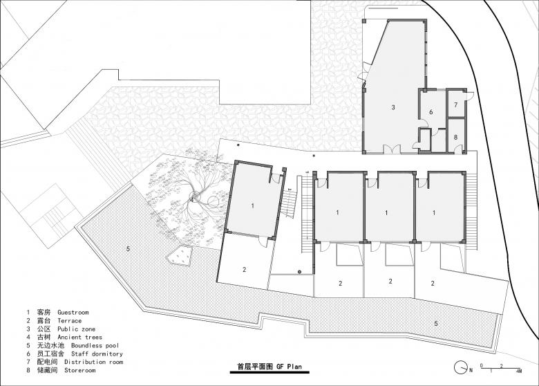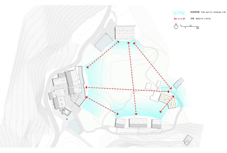 客房和接待区被安置在西侧和南侧的山脚下,在具备良好视野的前提下,尽量不占用田地。场地中原有道路向西挪动,从新建筑和其背后的山林之间通过,使新建筑与稻田之间不受交通的打扰,同时也便于后期运营中的封闭管理。书吧和室外大泳池布置在一起,它们位于稻田北侧,背后有树林作为依托。餐厅位于场地东侧,它是唯一一栋修建在稻田中的建筑,但采用了地埋方式,被隐藏在稻田中间。在场地核心区外围东南角的山林中,还建造有一座瞭望塔,它既可以用于登高观景,也兼做森林防火之用。