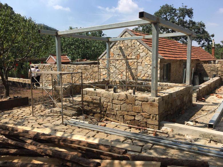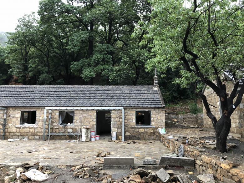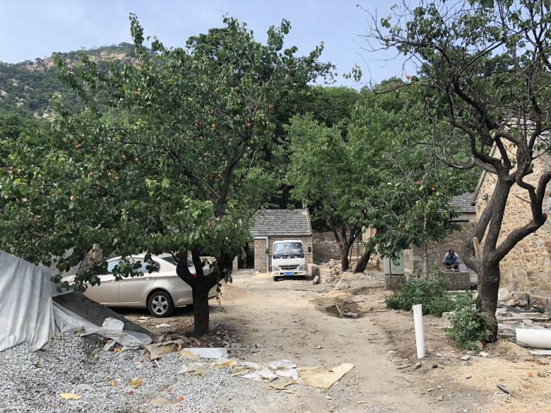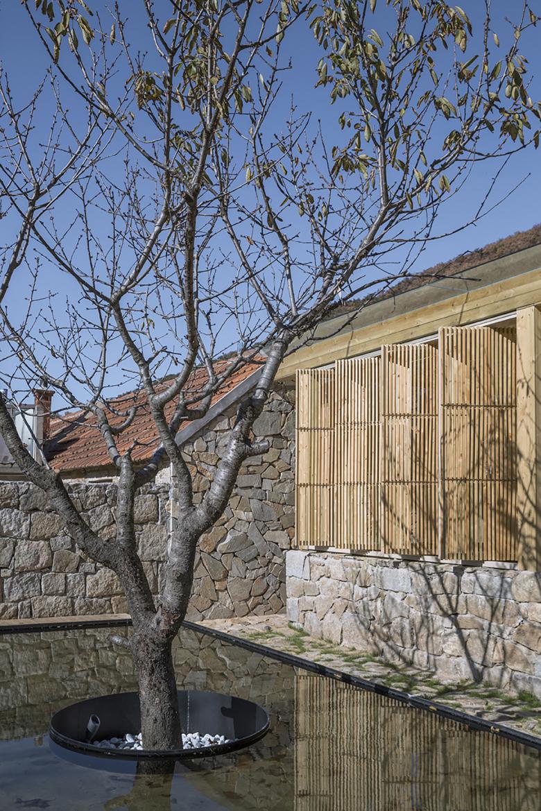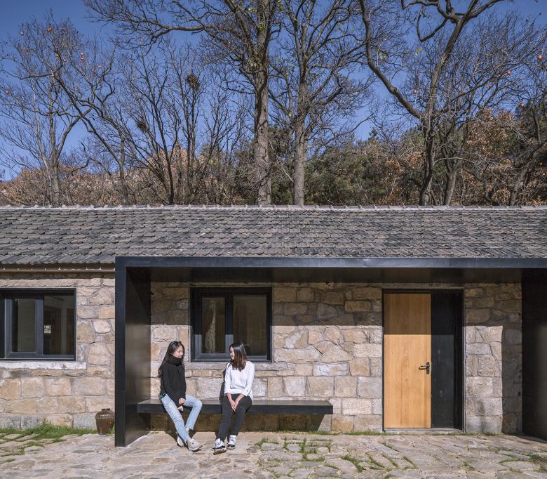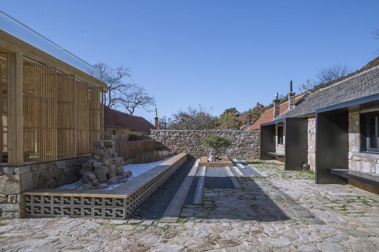 Known as “xiangdi” in ancient China, site investigation and selection is the first step of the design work. Lots of fruit trees grow on the project site, and between the two courtyards, a paved path leads to the back mountains, covered with all kinds of plants and tall arbors, such as persimmon and Chinese catalpa trees. The original architecture was a local residence in typical Jiaodong Peninsula style: a single-storey courtyard but not the kind of standard quadrangle one, with only a principle room and wing-rooms, dark gray hanging tiles and rough-stoned walls, heavy, decorous and resplendent. The designer admires heartily the handwork aesthetic perception of this kind of traditional masonry construction technique, which is in sharp contrast to the shoddy situation nowadays.