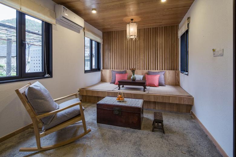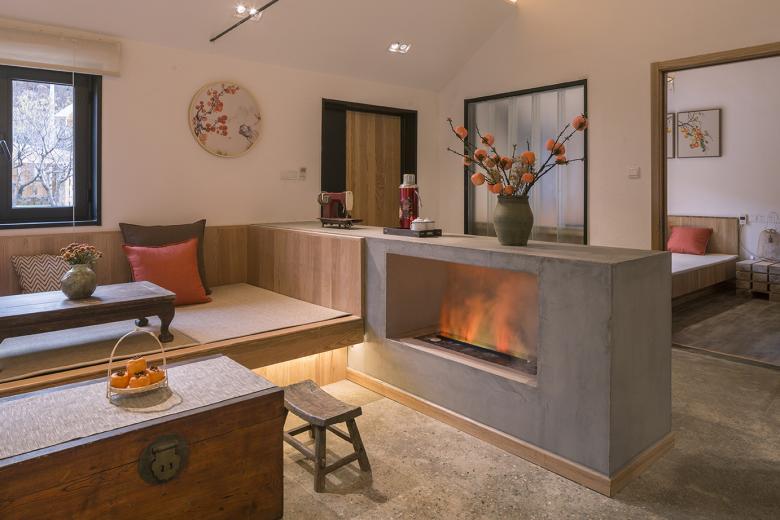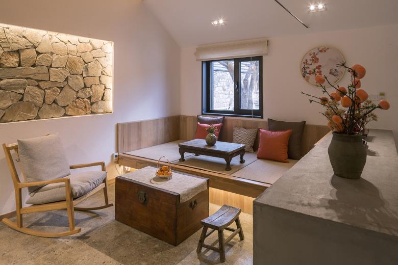 The architects haven’t deliberately preserved the original residential elements incl. cooking hearths and heated brick beds. On the contrary, we strengthened the guesthouse’s public spaces, enlarged the living room area, increased private bathrooms, and connected the inter-spaces between living rooms and spaces for resting tactfully. While the exterior appearance of the original architecture is completely preserved, merely steel arbour and seats are added to the main entrance, to meet the functional requirements. As for the furniture, the designer collected a mass of used local furniture, such as tables, chairs, benches, top containers, stitching machines, etc, which are placed into the spaces, tightening the connection between the guesthouse and local culture and embodying the theme positioning of a “countryside guesthouse”.
