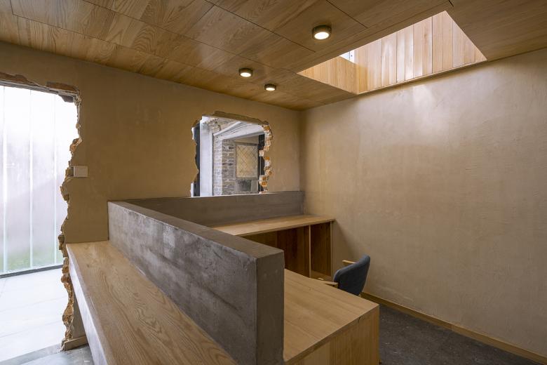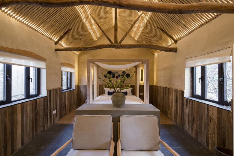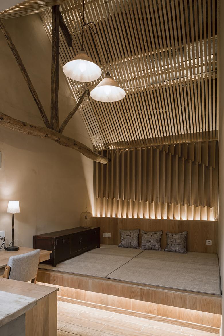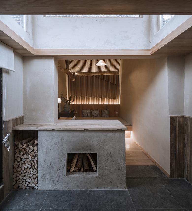 In terms of creating an indoor atmosphere, the designer also adjusted the interior space.After roofing repairs and adding a waterproof insulation treatment, the design team removed the original interior space's decorative ceiling, revealing the original building's distinctive triangular wooden trusses.As the height of the space increases, the comfort level and appearance are also improved.The designer deliberately left traces of demolition: rough yellow mud walls, gray cement floors, and recycled old wood and other elements, forming a slightly rough space base and casual farmhouse atmosphere.In contrast to these marks are fine woodwork, warm fireplaces and comfortable upholstery.The design team hopes to do this to satisfy the user's different visual and tactile experiences.However, it must be delicate, comfortable and soft within the touchable range to bring users a good experience.This is what Qin House hopes to convey to users.