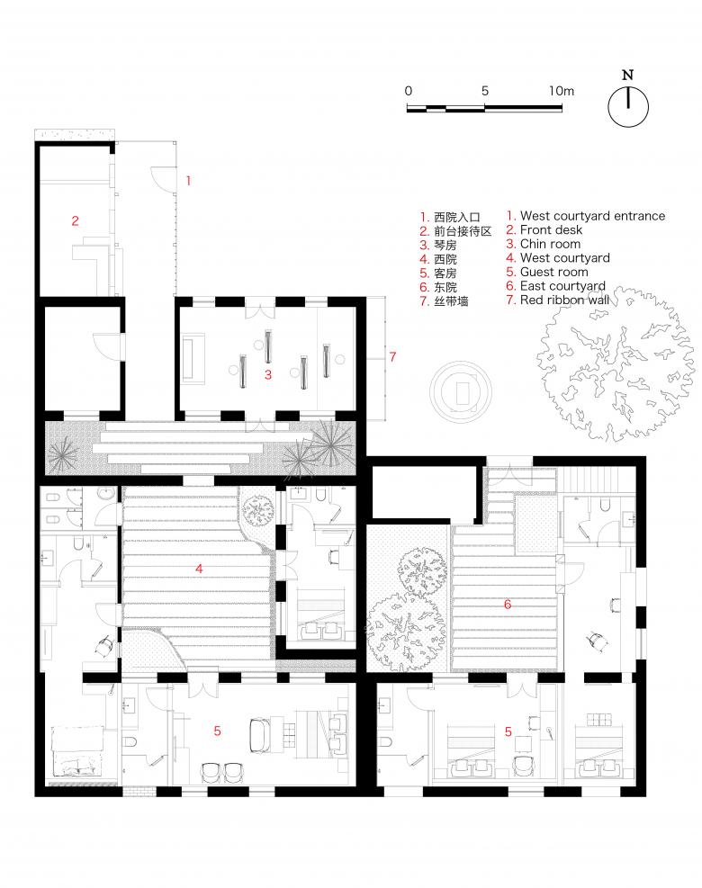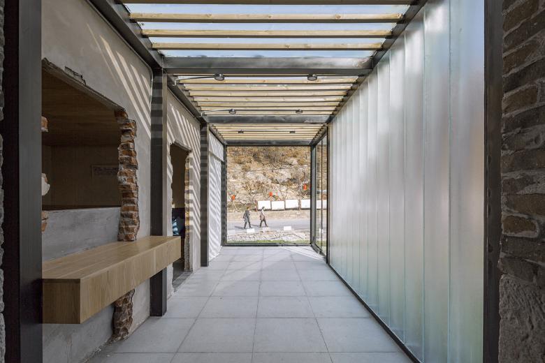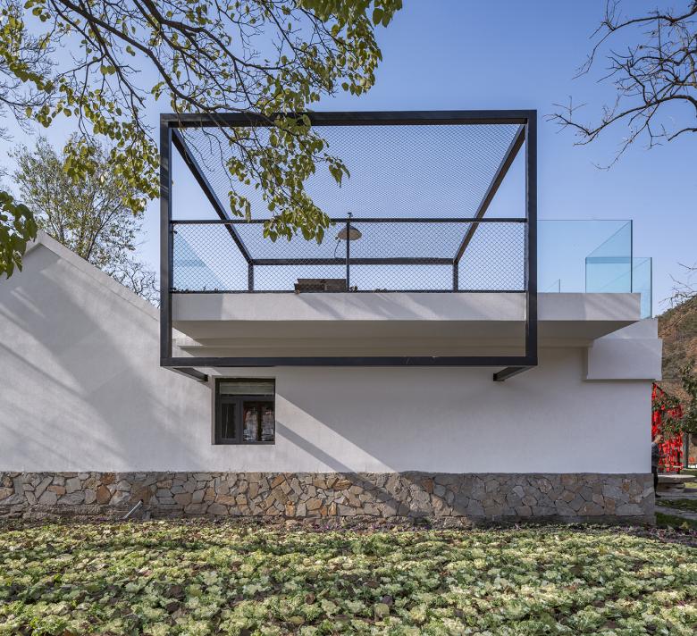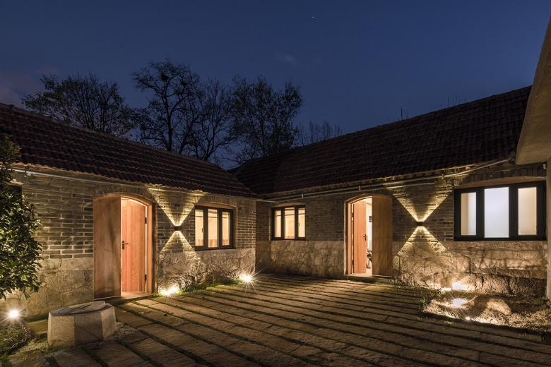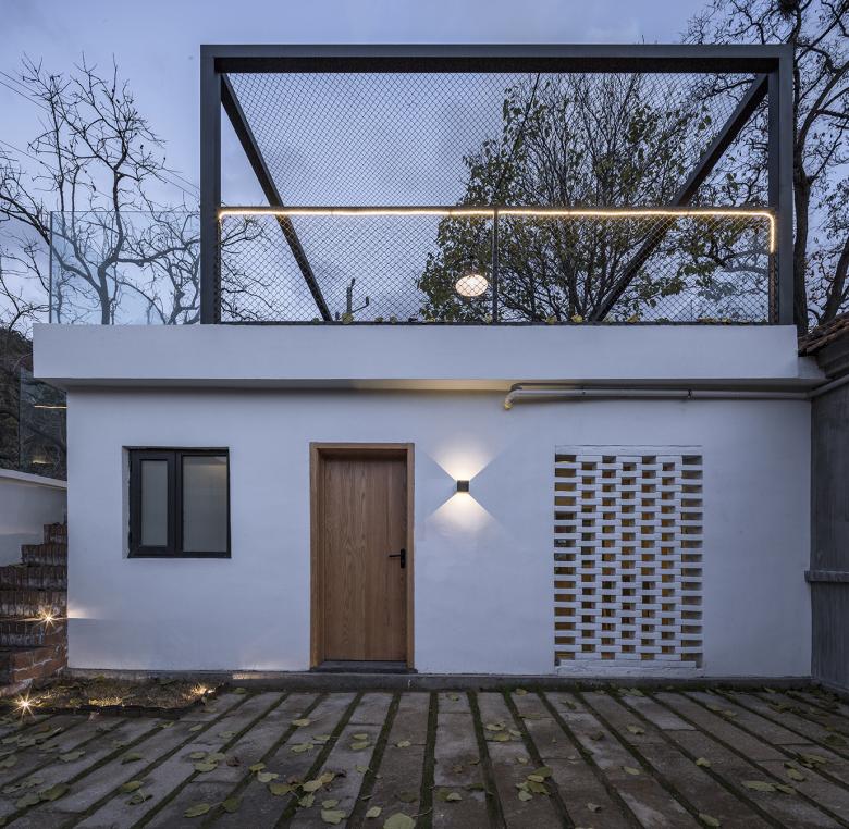 The space has been rezoned: the reception area, the piano room, and the five guest rooms with their own bathrooms have been transformed into an elegant cottage.On the premise of retaining the existing courtyard pattern, the design team rearranged the spatial streamline and added the entrance space of light steel structure in the northwest of the original house.Unlike the heavy brick facade, the new addition USES u-shaped glass as the facade material, which not only ensures the lighting of the internal space, but also has the appropriate privacy.Under the effect of internal light, the internal activities of the space are projected on the external facade, forming a blurred image, which has a dramatic contrast effect with the primitive original building.The east wing of the east courtyard is close to the core landscape of the village. The design team added a viewing platform on the roof of the east wing, which not only meets the user's needs for viewing and outdoor activities, but also increases the elevation change and interest of the space.