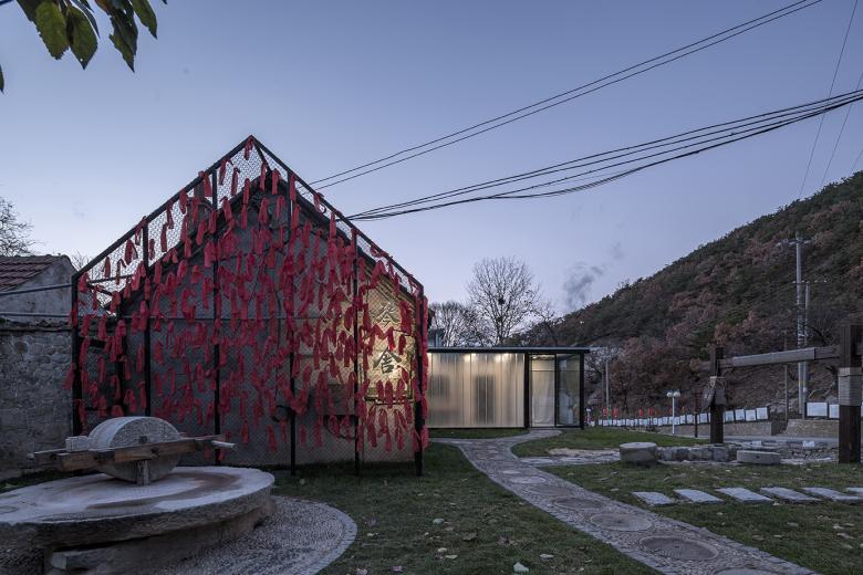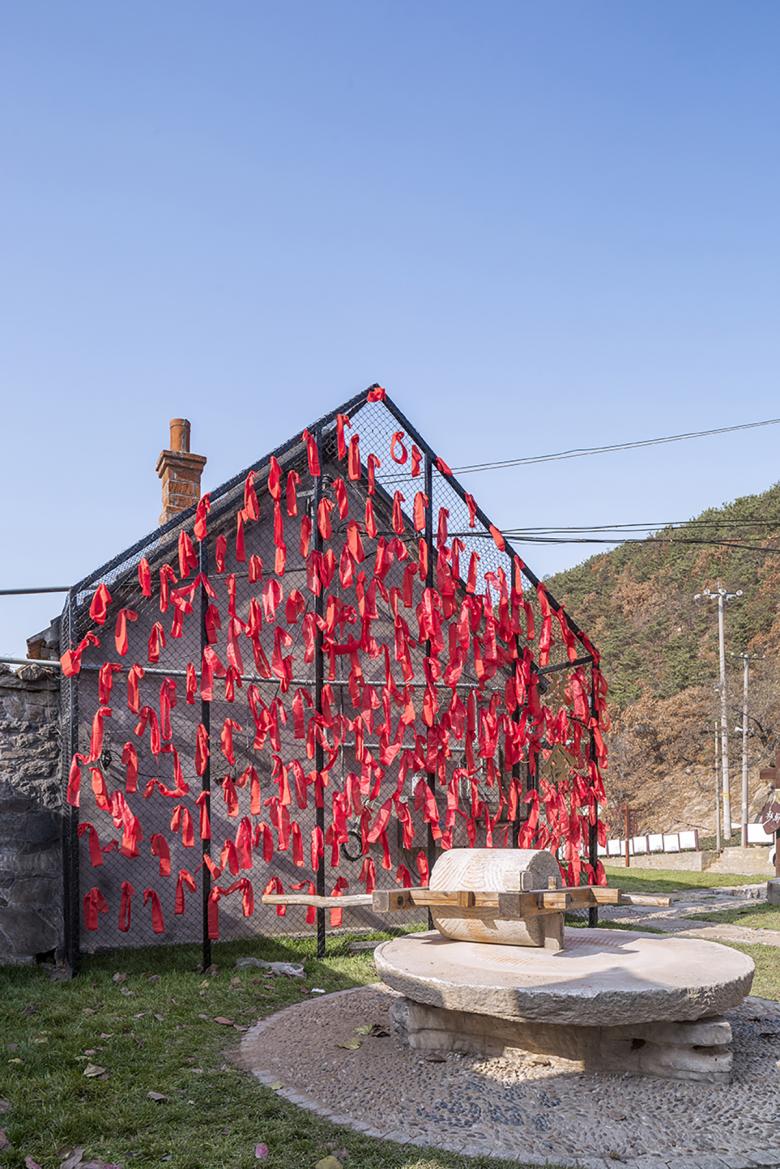 The east gable of the west courtyard is one of the main facades of the building, which can be clearly seen from the village view.However, the original building housed the electricity meter boxes of eight nearby households, and the power lines were disorderly, which caused problems for the operation of the new home stay facility.At first, the design team hoped to remove the electric box, but due to the extensive influence of the project, it was impossible to implement. Finally, the design team decided to add a steel wire mesh cover on the outside of the electric box.However, after the implementation, it is found that the shielding effect is still not ideal, the density of the wire mesh is so low that the shielding effect is minimal.How to do? The design team must quickly make adjustments in limited circumstances.A "public art" project was proposed: designers bought large quantities of red ribbons and asked villagers to tie them to steel mesh covers.The red ribbon not only blocks out the negative landscape elements behind, but also has the meaning of blessing. As a result, this "better late than never" measure has become the most popular "scenic spot" in the village.