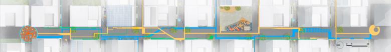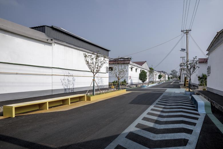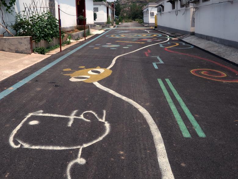 The main north-south street is composed of three color strip graphics, yellow for gas pipeline, green for weak current line and blue for sewer pipeline, and together with explanatory text, the artistic narration of main street pavement is constructed. The design is based on the following: the "scars" left by the pipelines laying on the pavement for many times. The architect believe that these scars record the construction process, and can be transformed into graphic expression and form a special text. Street furniture is not only functional, but also the continuation of the pavement narrative, which is also in blue, green and yellow, and is connected with the ground color strips. The streets and lanes are relatively relaxed, and children's paintings are selected, and there are also games loved by children, such as hopscotch and mazes. They provide a place for children in the village.