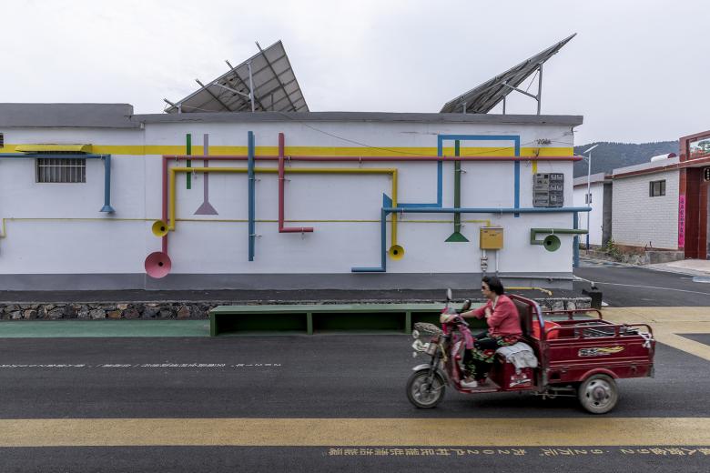 In the middle of the main street, a set of game devices are installed. Instead of high-tech and expensive materials, it's been a simple set of pipes and microphones. It is the continuation and artistic expression of the village infrastructure pipelines. The new device is connected with wall drawings, original pipelines and color belt patterns painted on the ground form the three-dimensional space narrative of wall and ground.