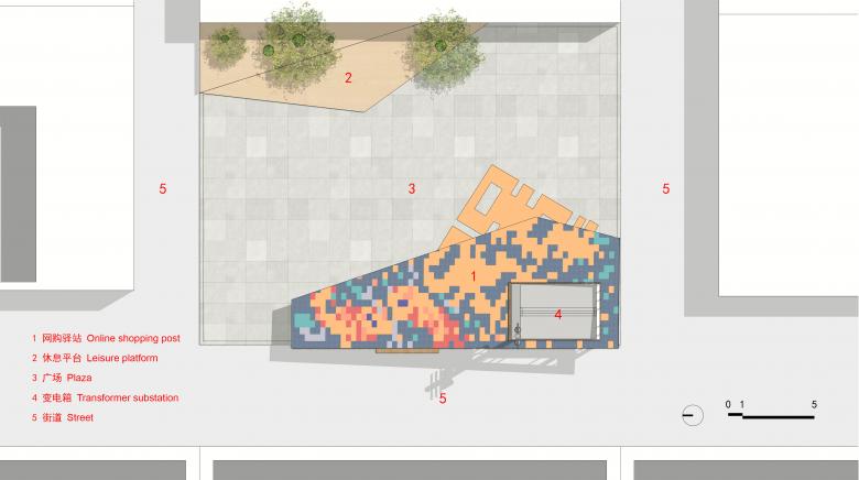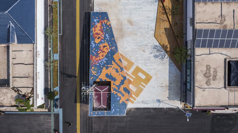 First, the site is hardened to make it more suitable for the function of square, then a notice board is added at one corner of the square and a rest platform at the other corner. Between the square and the main street, a new convenience service point is built to receive express delivery and small sales department. The original substation in the site could not be relocated. The architect changed the exposed substation facilities into a safer box transformer and incorporated it into the building, which is integrated with the convenience service point. The service point is trapezoidal in plane, with wooden structure and single slope top. The southwest corner of the roof is higher and the northeast corner lower. The architect uses the glazed tiles and facade of the roof to combine the "Double Happiness" and the Pisces patterns, representing the villagers' good wishes for life.