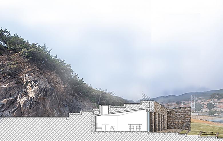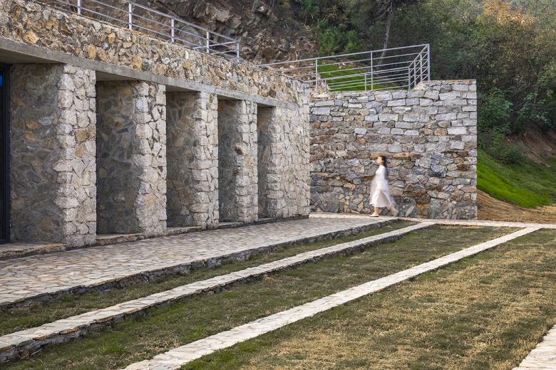 The ground of the original site is a slope descending downhill from the cliff, contrary to the ascend tendency of the audience area. Complied with this feature, a new architectural structure is added under the audience area, and they share the same supporting system, with functions of storage, public restrooms and café, providing the theatre with logistics and public supporting services. To avoid taking away the protagonist status of the cliff, the height of the architecture has been brought down as possible and its exterior appearance tends to be relatively orderly and neat. A series of French windows form the front architectural façade. And, with intentionally consolidated thick walls between the windows, the architect hopes to give a feeling of a cave, echoing its history as stone pit. On both sides of the building, steps and ramps are arranged for people’s entering and leaving the stage zone, surrounded by high and big walls and slightly oppressive or circuitous, becoming transitional space before entering the main space, which cause an effect of “refraining before highlighting”. Rubbles are chosen as building materials for masonry construction, among which most of the rubbles come from the stones excavated during site formation. Through this, the architect hopes to express the concept that, both in terms of form and physical attributes, the architecture naturally grows out of the site.