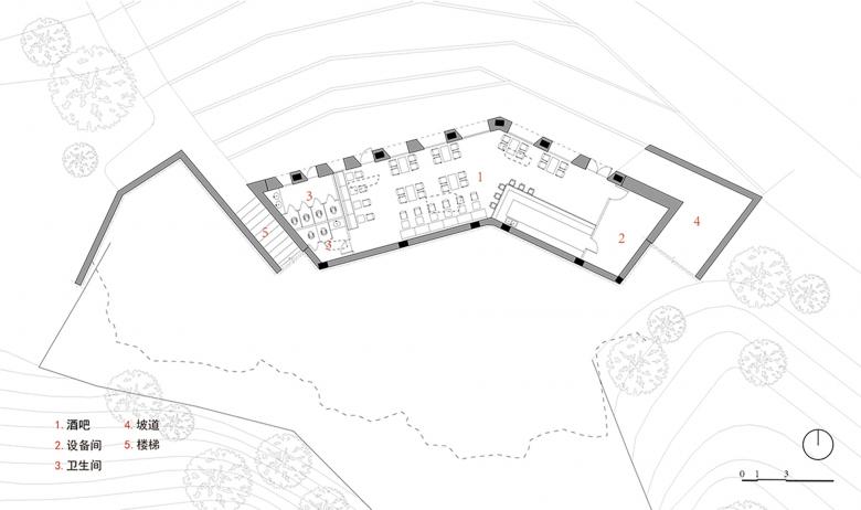 The cliff of the site is intactly preserved, without any processing, as the background wall of the amphitheatre, which, with its arc-shaped form produced by quarrying, realizes excellent acoustics. From the architect’s point of view, the cliff itself is the most significant content of entire the performance, which is not only the background of the stage, but also one of the major performers. Its existence, as the start point of the whole space, determines the characteristics and atmosphere of the theatre. The audience area is set up hemming in the cliff, of which the height is gently elevated starting from the horizontal plane of the stage, forming a rounding up field. The shapes of the stage and the audience area are fitted to the original terrains, not pursuing symmetry. The seat terraces of the audience area are designed as free broken lines to strengthen the landscape efficacy of the venue.