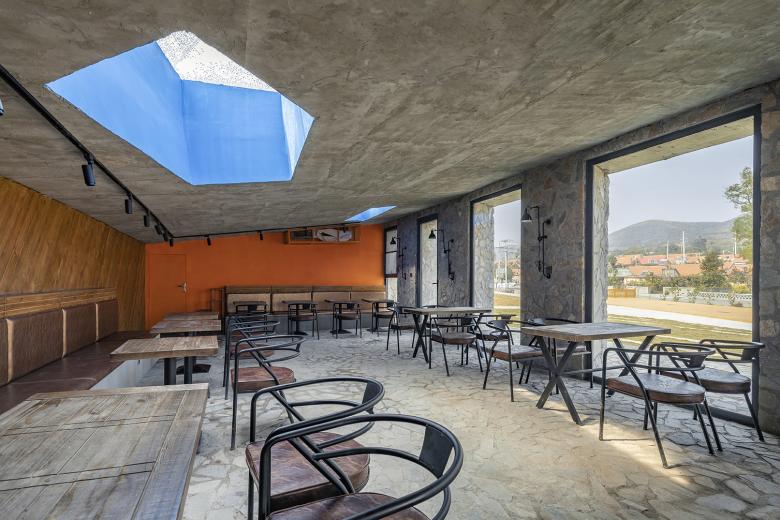 The interior space of the architecture is small and relatively simply planned, with slanting roof, on which the irregular skylights imply the connection of the building to the audience area while enhancing the dramaticism indoors. Through the fundamental intension of cave, pit and industrial sense for the interior architecture design, the architect hopes to endow the spatial atmosphere with an ardent and hard touch. Stone, slightly rough timer, leather and metal become the preferred materials for the spatial moulding. Lamps and furniture in industrial style also intensify this aura. Exposed light sources produce enchanting dazzle lighting. Coupled with the orange hue on the east and west walls and the sapphire tone on the inner walls of the skylights, the interior architecture emits a retro lethargic sense.