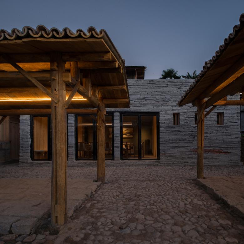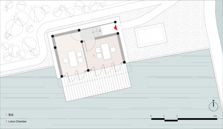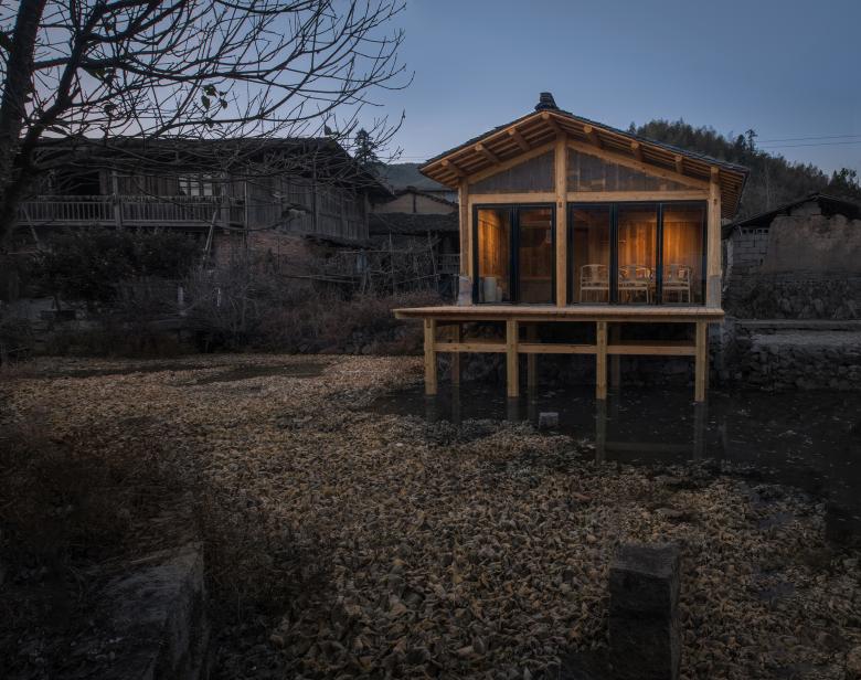 Lotus Chamber is a teahouse transformed from a old utility room. It represents ‘Being Incorruptness’ for having the same pronunciation with integrity in Chinese. This building is the most obvious one by the pond next to Tai Fu Tai Mansion. The design kept old rubble wall and only fixed non-recyclable wood structure on the upper level, then making it a teahouse by water. Users can walk through a glass door, stand on the platform and enjoy spaces over the pond with lotus, referring back to the name ‘Lotus Chamber’.