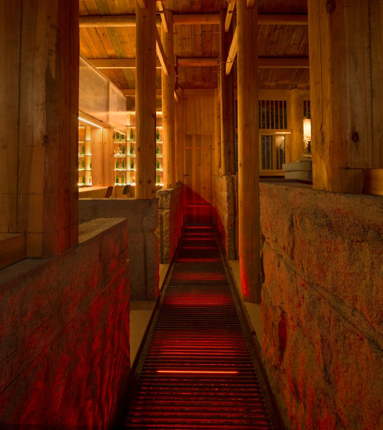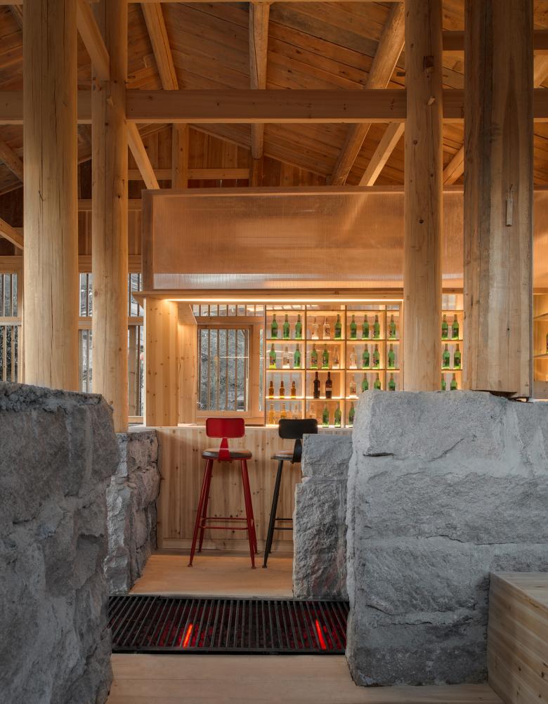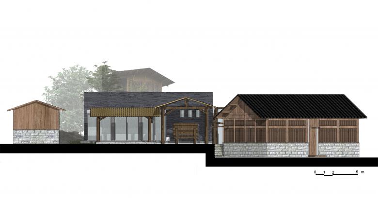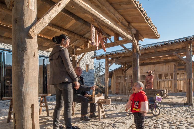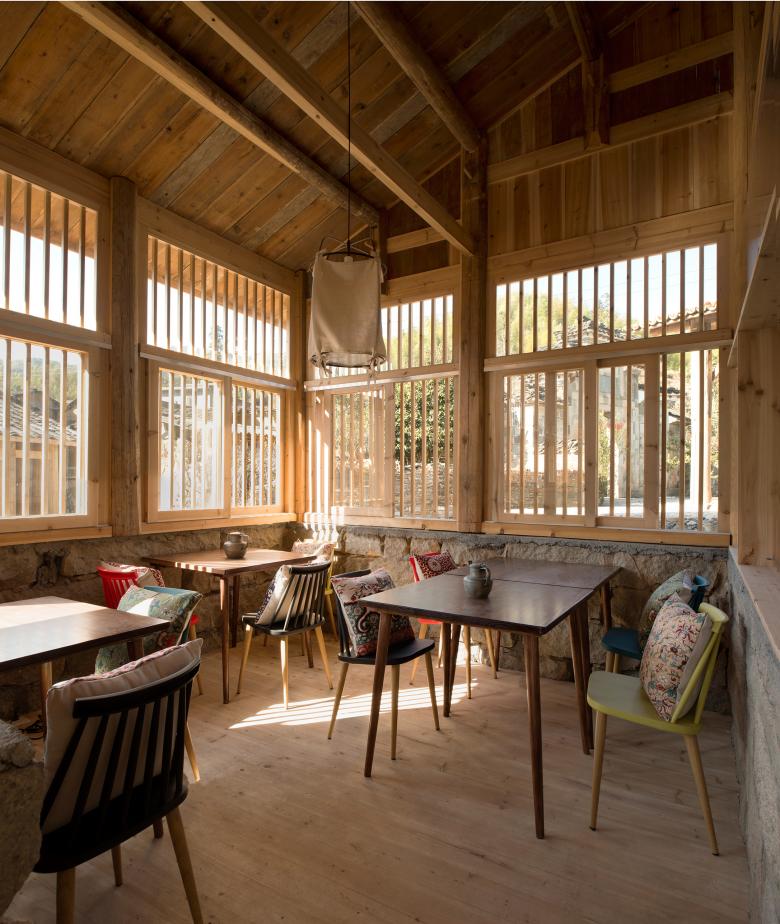 From a deserted pigsty to a bar: ‘Pigsty Bistro’ is a major new building in this area. The exterior of the building is not aggressive by keeping previous materials: rubbles and wooden roof. The floor plan is divided into four part for raising pigs. Each square is infilled with new bar, coffee table and Kang table (a heatable brick bed). The design would like to create a cosy and dramatic atmosphere by placing colorful floral pillows, Kang table, pigsty feeding,rebar decorated floor and color variable LED lights, etc. Some of these ‘Exotic’ stuffs makes it more interesting for visiting, especially for youngsters.