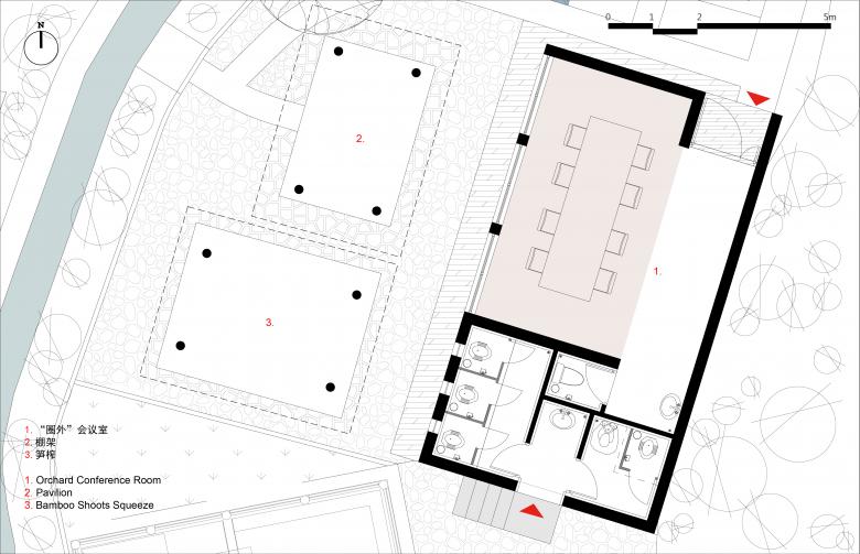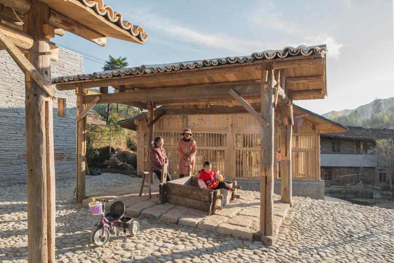 The last design area of the Shang Ping Village Regeneration is somewhere hidden inside the village. It locates on the east stream. According to the legend, a giant house named ‘Tai Fu Tai Mansion’ at here was built by a famous government officer after retirement. The gate tower is well preserved but the main building was destroyed by a fire many years ago, which is quite regretful. The original cultural elements and landscape like pond, ancient wells, bamboo shoots squeeze, gateway and the ancient stage ruins are utilized by designers for the regeneration. Some unused structures such as pigsty and shed are obvious on site, which is remained to be major landscape elements. Actually, these existing structures become great resources for new types of business as well as village revival.