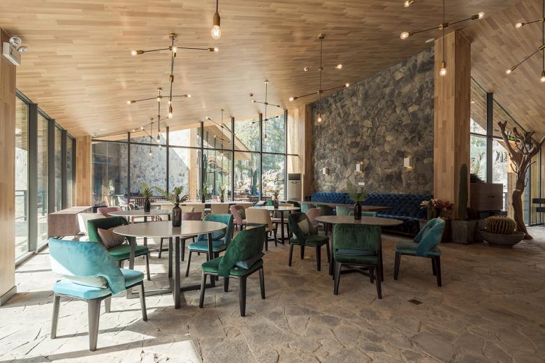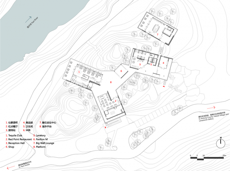 The Tourist Center consists of four parts: a reception hall, a restaurant (“Red Point Restaurant”), a club (“Tequila Club”) and a conference hall (“Big Wall Lounge”), whose overall layout has been distributed around the rocks , illustrating the coexisting status of appearance and cohesion.