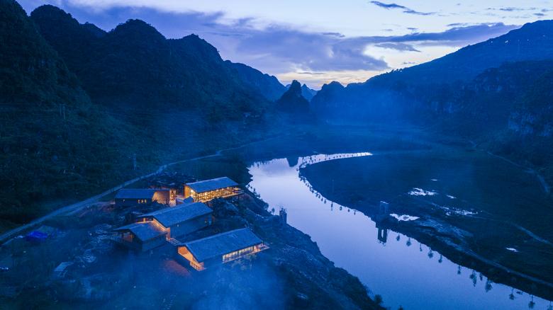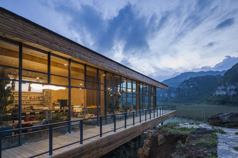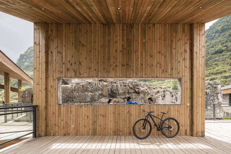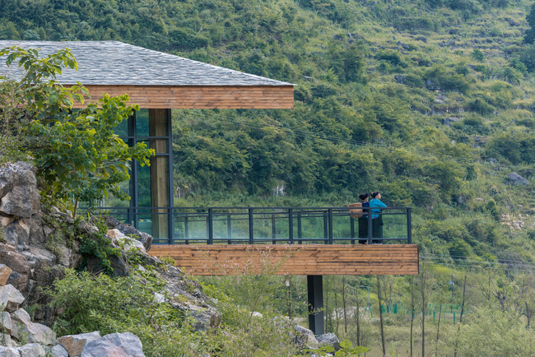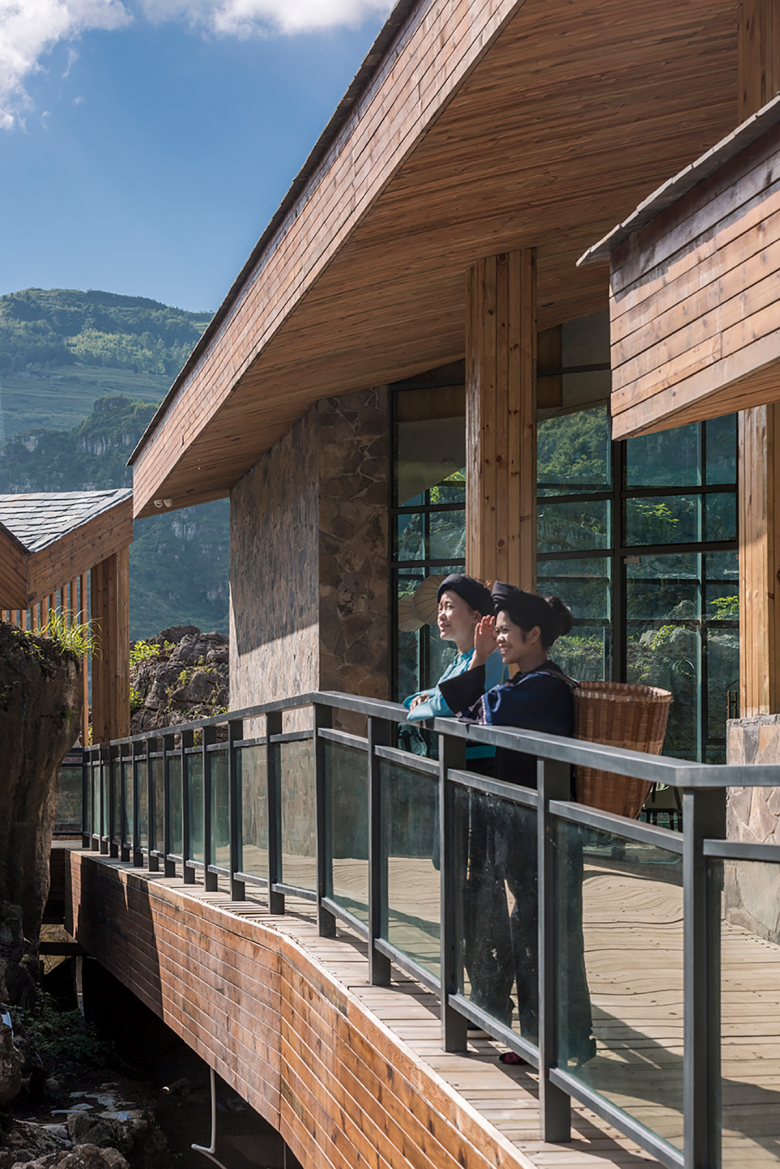 The newly designed buildings are following the form of traditional double-slope residential houses in southwest Guizhou, whose facade materials are basically local stones. The designer team would not intend to highlight the buildings that could never been compared with the surrounding mountains and rivers. The only thing designers could do is to respect for the nature.