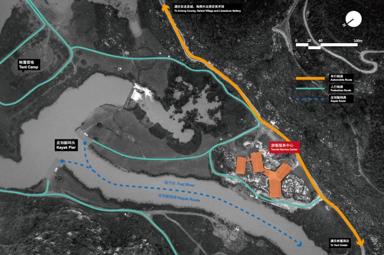 The Tourist Center is located on the top of a hill that lies at the bottom of the canyon. The reason to choose this location is that the hill is the only high point of the canyon with a good view and very eye-catching, which could make this group of buildings the visual focus and resist from annual flooding. Since there is a lack of hydrologic data of this area, the design team can only determine the floor height according to the oral instructions of local people and construct the entire group of buildings on a high platform.