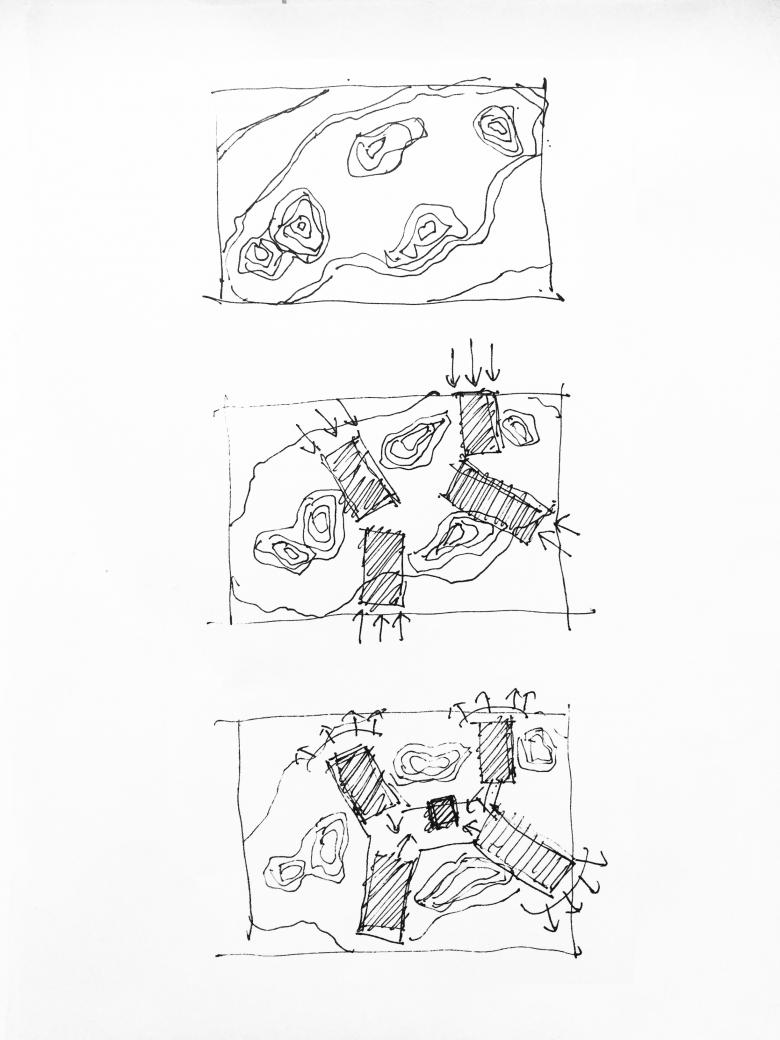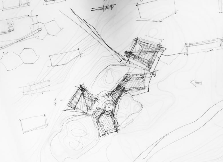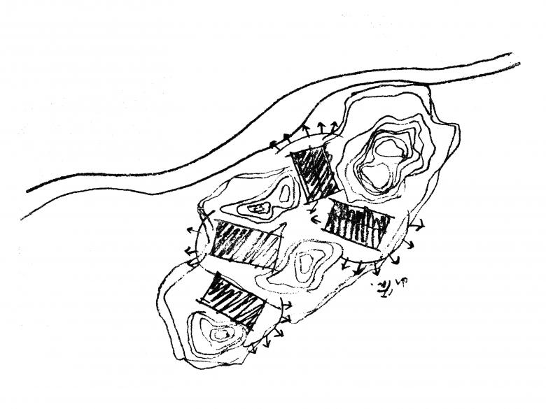 During the site visiting, the designers have found that there are four peaks on top of the hill, in between of which are highlands. The designers break up the entire block into single pieces and hide them in the peaks and highlands, accommodating a symbiotic relationship of rocks and buildings: the buildings are hidden in the rocks while stretch out from the gaps.