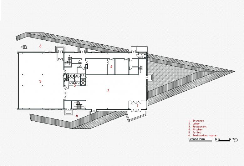 The main building has four floors. Through the stacking and dislocation of horizontal blocks, the functional problems are solved and the space is created at the same time. The outer skin of the building is a rectangular tube inserted obliquely into the ground, with four faces exposed to the ground, forming a "package" for the main body of the building. The two systems form a strong interleaving between the body and the epidermis: some body blocks insert outside the inclined epidermis to form a triangular "bulge". There also are gaps between the inclined planes and the main body in some positions, forming a number of sheltered semi outdoor activity spaces, providing users with different experiences.