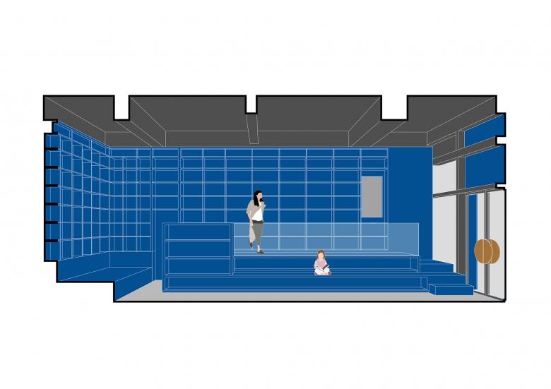 在空间布局上,为不同的人群营造不同的空间场景。入口为休闲区域,穿过吧台为图书取阅区,反方向为儿童区。日常时,儿童区与休闲区相连为一体;当儿童区举办亲子活动或课程时,将一面巨大的推拉书架拉开,儿童区就成为了一个相对独立的空间。从阅读区的安静,到休闲区域的闲适,再到儿童区的热闹,三重空间动静分离。空间材质和色彩也极为丰富,透明的水晶玻璃砖,镀金的不锈钢金属,黑白格地砖,胡桃木色拼花木地板,通高的蓝色书架,绿色的包装纸架,都是这座书籍之岛的一部分。