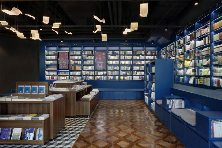 The entrance of the building is designed with double-height blue aluminum plate, slightly protruding from the facade of the glass curtain wall, and the metal edge details outline the door head, strengthening the sense of longitudinal extension and the visual identity of the bookstore. The 36-meter dark gray folded aluminum plate, like streamers, encircles the building facade of the site, emphasizing the interface of the bookstore. The upper and lower boundaries of the streamers have metal edges, on which many famous rhesis about books and reading are welded. Under the sunshine and light, the light and shadow of these beautiful sentences are dancing on the folded plate, as if they had a musical rhythm and soul. The facade design of the whole building is endowed with strong cultural connotation on the basis of strong sense of modeling. The designer does not use too much lighting at the door, but through the way of interior light sources, everything inside the building is like a lighthouse, guiding your life voyage.