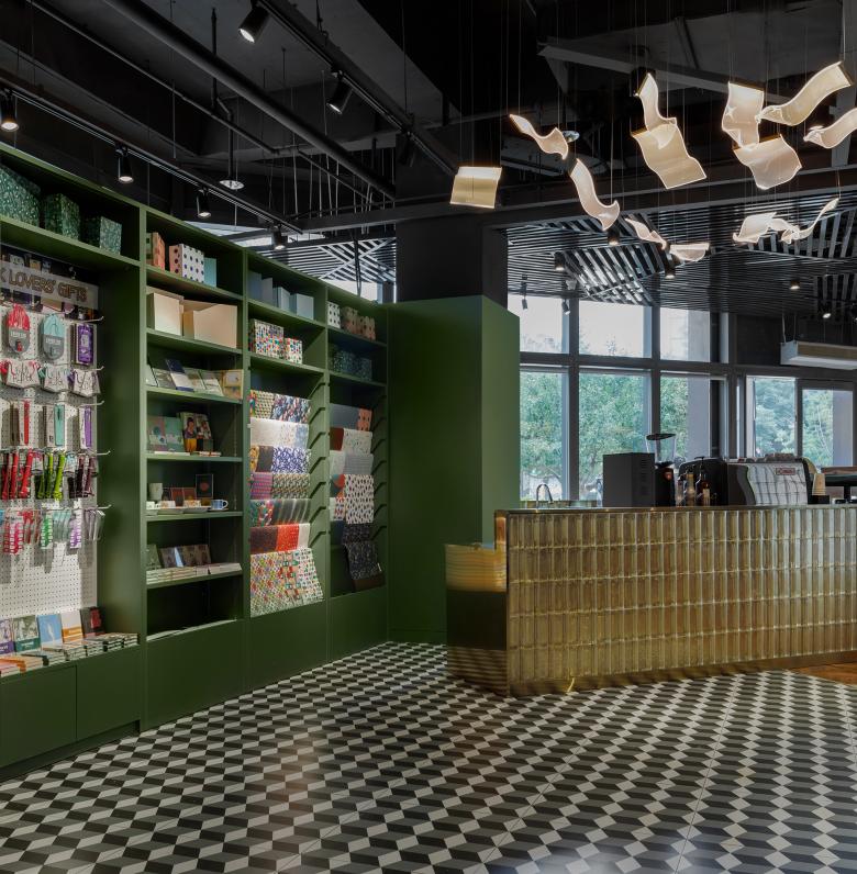 In terms of spatial layout, different space scenes are created for different groups of people. The entrance is the leisure area, reading area is on the other side of the bar, and to the opposite direction is the children's zone. In daily life, children's area is connected with leisure area. When parent-child activities or courses are held in the children's area, a huge push-pull bookshelf will be pulled aside and the children's area becomes a relatively independent space. From the quiet of reading area, to the comfort of leisure area, and then to the jollification of children's area, the spaces are separated into dynamic and static parts. The materials and colors of the space are also very rich. Transparent crystal glass tiles, gold-plated stainless steel metal, black-and-white floor tiles, walnut parquet flooring, double-height blue bookshelves and green wrapping paper shelves are all parts of this island of books.