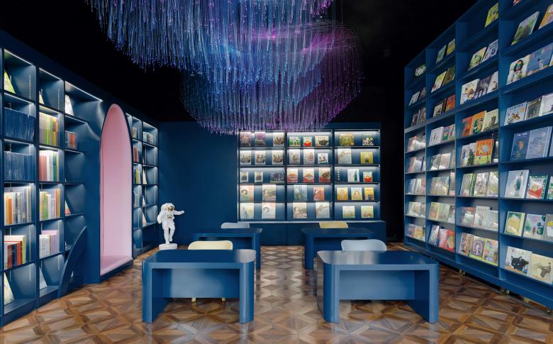 从收银台右转,就进入了图书展阅区。亚克力灯如同书笺一般漂浮在空中,深蓝色通高书架与葱绿色包装纸展示墙相互呼应。为了在有限的层高内增强空间的错落感和丰富性,在两组通高书架底部分别设置了不同高度的地台,相对低矮的地台也可用作运营过程中举办活动的小舞台,已在试营业期间举办了“小小演说家”的活动,相对高些的地台让读者更方便取阅高处的书籍,回望整个阅读区,每个独立的书台像小小的岛屿,而你,正站在甲板上,向诗与远方航行。
