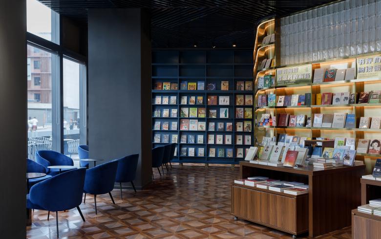The golden bookshelves extend to the leisure area, and six groups of coffee seats installed along the glass curtain wall. Order a cup of coffee, lean on the velvet fabric deep blue leisure chair, holding a beloved book, shield yourself from the endless traffic stream and people coming and going in the city.
