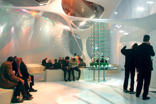 Messeauftritt als atmosphärische Interpretation der Unternehmensphilosophie. Der Innovationsanspruch des Kunden spiegelt sich in der Modernität des Designs sowie der eingesetzten Technologien und Materialien wider.