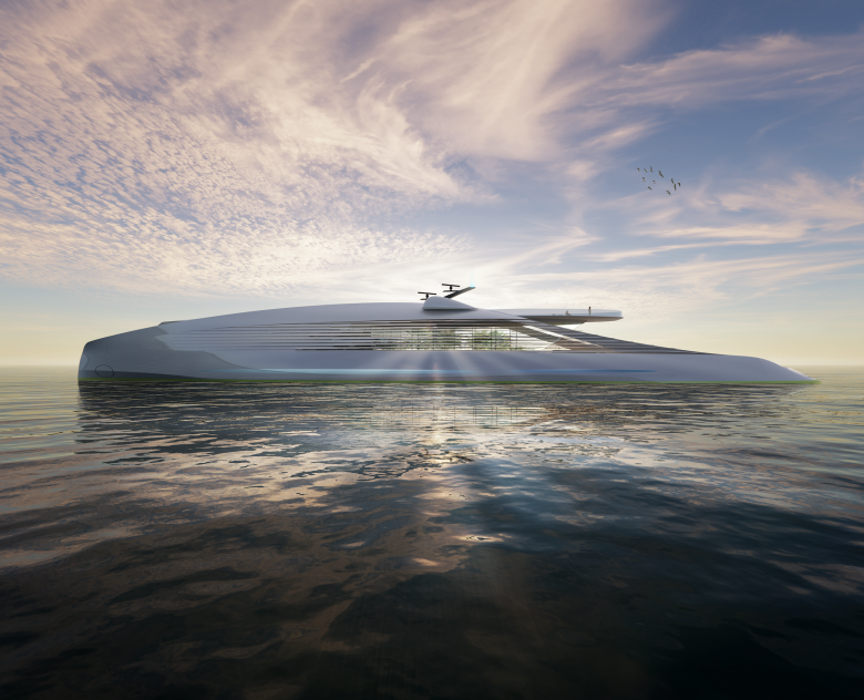 Das schlichte, elegante Äußere des Schiffes zeichnet sich durch eine homogene, geschlossene Form aus. Reduziert und stromlinienförmig leistet das Volumen möglichst wenig Widerstand gegen Wind und Wasser. Der Rumpf geht übergangslos in die seitliche Fassade bis zum Hochpunkt des Schiffes über. In die hochgezogenen Seitenwände sind sensorgesteuerte Lamellen integriert, die den Lichteinfall in die oberen Decks regulieren und bei schneller Fahrt und widrigem Wetter geschlossen werden können. Das geschützte flache Dach ist verglast und lässt Tageslicht in den Innenraum. Neben dem Glasdach sind auch die seitlichen sensorischen Lamellen mit transparenten Photovoltaikzellen belegt, die Strom für die Klimatisierung, Licht und die Entsalzungsanlage liefern. Der Steuerstand ist unkonventionell am Bug verortet, somit kann das hintere offene Sonnendeck übergangslos in ein großzügiges one-space Innenraumkonzept übergehen. Am offenen Heck befindet sich ein Salzwasserpool und eine kleine Marina mit direktem Zugang zum Meer.