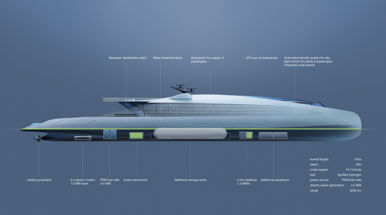 Als attraktivste und zukunftsweisende Schlüsseltechnologie für emissionsfreie Antriebe auf Kreuzfahrtschiffen und Yachten wird zurzeit die mit Wasserstoff betriebene Brennstoffzelle bewertet. Der für die Brennstoffzelle notwendige Wasserstoff kann entweder getankt oder über emissionsfrei produziertes Methanol lokal erzeugt werden. Methanol ist in Verfügbarkeit und Handling unkomplizierter als Wasserstoff. Mit einer Tankfüllung Bio-Methanol kann eine Brennstoffzellen-Yacht bei langsamer Fahrt immerhin 1000 Seemeilen zurücklegen. Zurzeit ist diese Technologie noch teuer. Mit der entsprechenden Ausgereiftheit und größerer Vermarktungsperspektive, wird diese aber auch für die kommerzielle Seefahrt zunehmend erschwinglicher werden. Durch die geräuschlosen Elektromotoren, die man auch dezentral im Schiff verteilen könnte, gibt es keine Lärmbelästigung nach Außen mehr und auch das Innere des Schiffes wäre ungewohnt Geräusch- und vibrationsfrei. Nicht nur der Betrieb, sondern auch die Herstellung einer Yacht sollte so emissionsfrei und Ressourcen schonend wie möglich sein. Es gibt bereits einige innovative Stahl- und Aluproduzenten in Norwegen und Deutschland, die die CO2- Emissionen durch die Verwendung regenerativer Energien, optimierter Herstellungsverfahren und Wiederverwertung deutlich nach unten drücken. Eine ähnliche Betrachtung/Optimierung sollte auch der Gesamt-Herstellungsprozess der Yacht erfahren. Denn auch hier könnte der innovative Yachtbau ein Antreiber für die emissionsfreie Zukunft der gesamten Schiffsbranche werden.