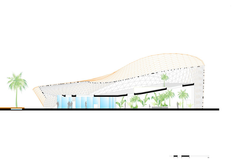 Das aus drei ineinandergreifenden Flächen geformte Dach spannt einen 800 Quadratmeter großen Freiraum auf. Besucher stehen in einem organischen Körper, getragen von baumartigen Stahlstützen und neun Auflagerpunkten am Rand. Er erinnert an einen Kokon, wie ihn Schmetterlinge zur Verpuppung ausbilden. Gefestigt wird das stählerne Tragwerk durch einen umlaufenden, dreidimensional ausgebildeten Randträger, der die Spannung des Dachs aufnimmt, und durch ein Netz aus Knoten und Dreiecksverbindungen. Die Herausforderung der nach der Finite-Elemente-Methode (FEM) berechneten Stahlelemente bestand darin, die theoretisch erforderlichen 4000 individuellen Knoten so zu systematisieren, dass schließlich 600 ausreichten, um den richtigen Grad zwischen Varianz und Effektivität zu erzielen. An jedem Knoten laufen die tragende Stahlstruktur und die nur drei Millimeter dünnen Aluminiumblätter zusammen und nehmen in mehreren Ebenen eine Vielzahl unterschiedlicher Verbindungswinkel auf. So entstand ein flirrendes Blätterdach, unter dem Anschlüsse und Verschraubungen unsichtbar verlaufen.