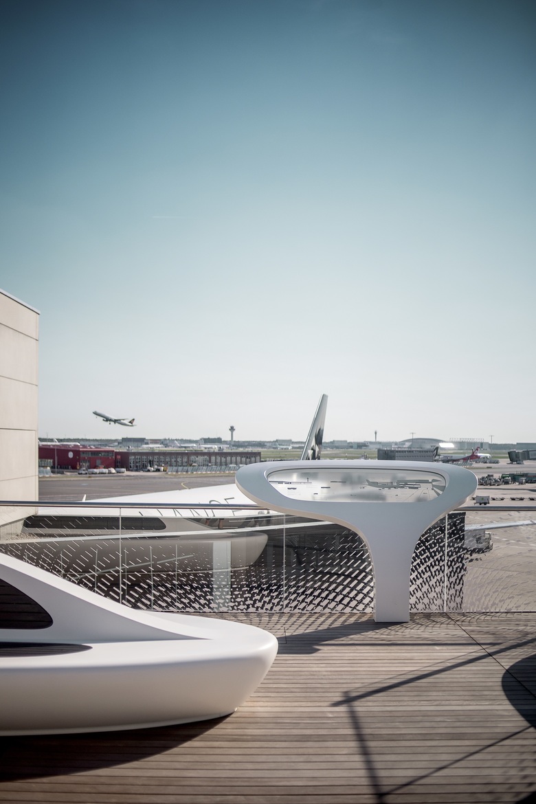 Die Terrasse ist Teil der ‚Leisure Zone‘-Serie, einer Reihe von einladenden Wartebereichen inmitten des umtriebigen Flughafenumfelds. Als zentrales Gestaltungselement werden die dynamisch geschwungenen Sitzmöbel der Indoor-Lounges wiederaufgenommen, die hier im Außenbereich mit Holzelementen und integrierten Pflanz-Inlays versehen sind. Im Fokus steht das Wohlbefinden der Fluggäste. Das modulare Mobiliar aus weißem Mineralwerkstoff ermöglicht verschiedene Sitz- und Liegepositionen und mit ihrer hellen, positiven Atmosphäre hebt sich die Dachterrasse deutlich von konventionellen, häufig starr und linear gestalteten Wartebereichen ab.