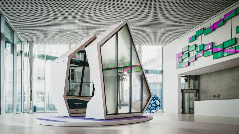 Wie ein herausgeschnittenes Fragment einer hochmodernen Holzarchitektur steht dieser als skulpturales Objekt im Merck Innovation Center in Darmstadt.