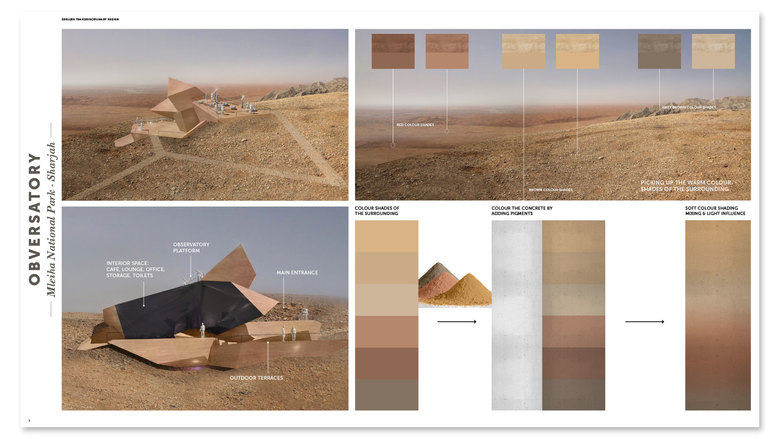 Der Entwurf wagt den Spagat, ein futuristisches Gebäude behutsam und harmonisch in die ergreifend schöne Wüstenlandschaft des Mleiha Desert Nationalparks zu integrieren und erweist sich mit diesem Konzept als zukunftsweisendes, nachhaltiges Tourismusprojekt.