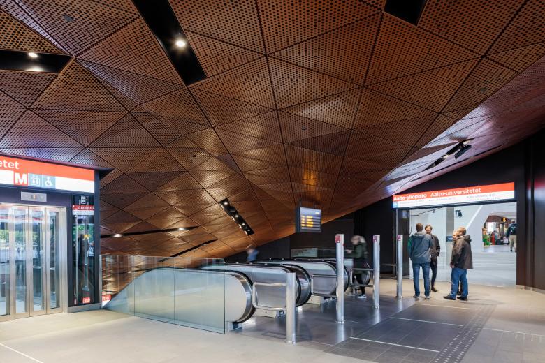 Among other design decisions, the Aalto University station distinguishes itself from the other stations along the metro route through its rich material palette. The palette has been picked as to avoid gloss, and to emphasize natural materiality. The station’s lowered ceiling is made of Cor-ten steel panels. The faceted ceiling flows through the main entrance, to the platform level and up to the secondary entrance on Tietotie street. It visually connects all the public areas of the station, and relates to the surrounding red brick environments with its color. Aged dark copper sheet cladding, grey granite and Cor-ten sheets form the basis of the material palette for the above ground parts of the entrance pavilions. Visible structures are reduced in the entrance space with an engineered, athletic, light form reminiscent of origami. Daylight is brought down to the platform level via an escalator shaft that terminates with a view towards the lime alley of the Otaniemi Mansion.
