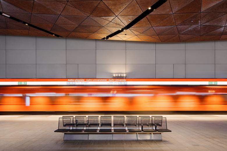 The Aalto University metro station completed in the first extension phase, resides in the heart of the university campus in Otaniemi. Its main entrance opens straight towards the former university main building, designed by Alvar Aalto.