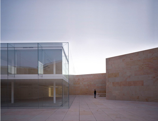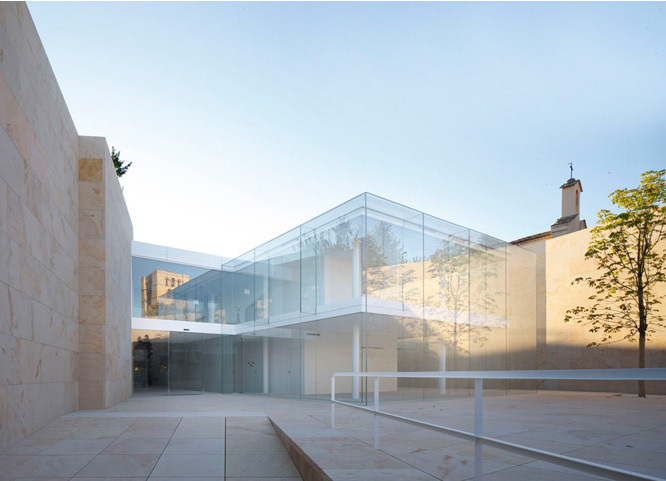 It is a stone box open to the sky that holds a crystalline box and protects it and tempers it, immersed in the midst of a wonderful garden.