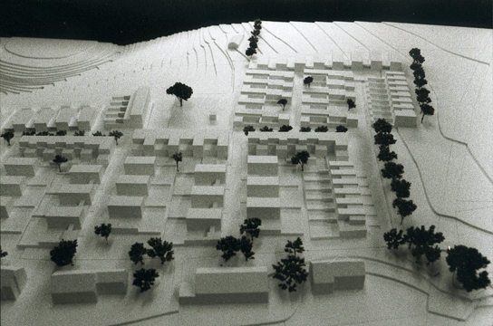 Unser Wettbewerbsbeitrag für 105 Öko- und Passivhäuser präsentiert sich deshalb als kleine Hügelstadt, deren Gestalt die weichen Linien der Landschaft aufgreift, ihnen geometrisch antwortet und sie verstärkt. Im Innern entstehen intime Gassen und sichtgeschütze Gärten um einem zentralen Platz, von dem aus der Blick über das Tal hinaus in die Landschaft fällt.