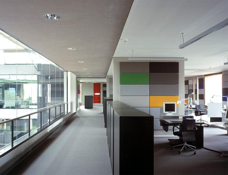 Um das ‚optische und akustische Raumklima‘ positiv zu beeinflussen, wurde ein System von stoffbespannten Paneelen entwickelt. Über 1500 dieser Tafeln in 17 verschiedenen Farben sorgen, in Gruppen an den Wänden der Büroeinheiten hängend, für eine angenehme visuelle Erscheinung und Akustik. Je nach Tageslicht und Himmelsrichtung verändert sich die optische Wirkung der Stoffpaneele. Im Herbst korrespondieren beispielsweise andere Farben mit den Farben der umgebenden Natur als im Frühling und treten dann in den Vordergrund. Auch im Tagesverlauf verändert sich der Farbeindruck. Diese wechselnden Farbwirkungen sind sehr dezent und bereichern die Raumatmosphäre. Die Farbflächen sind keine zufällige Auswahl: Sie wurden in Format, Maßstab und Proportion, Menge, Dichte, Oberfläche und Textur, nach Reflexionsvermögen und der Interaktion mit benachbarten Farbfeldern ausgesucht und gezielt platziert.