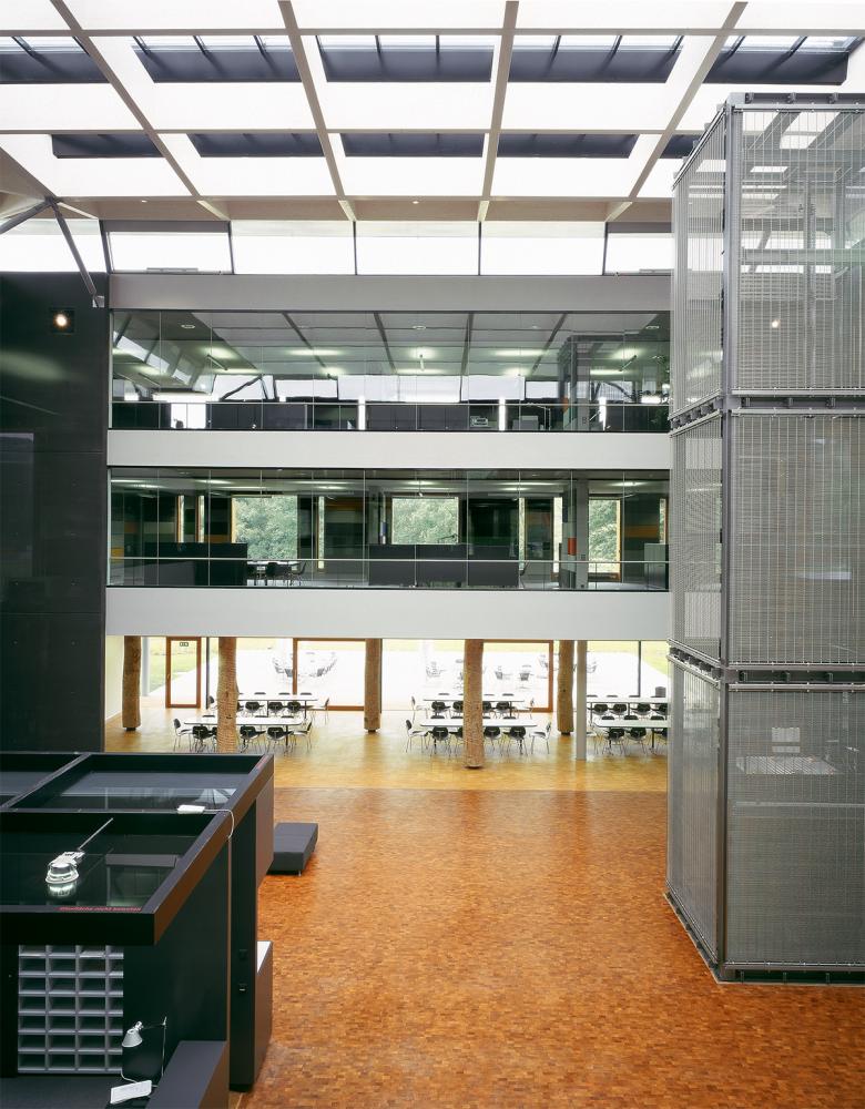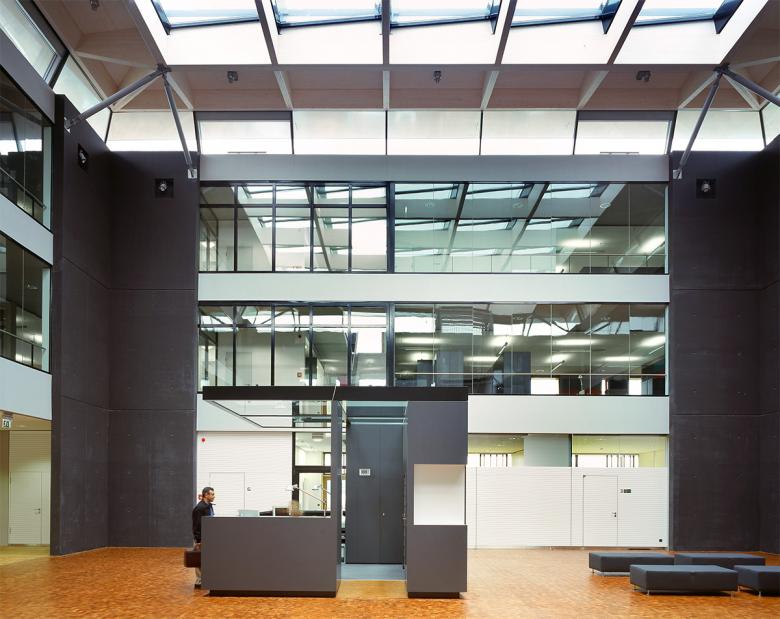 Im Erdgeschoss gruppieren sich Besprechungs- und Serviceräume sowie eine Cafeteria um eine zentrale dreigeschossige Halle. Die Bürobereiche in den beiden Obergeschossen orientieren sich ebenfalls zum Atrium hin. Durch die großzügige Verglasung sind sie sehr gut belichtet.