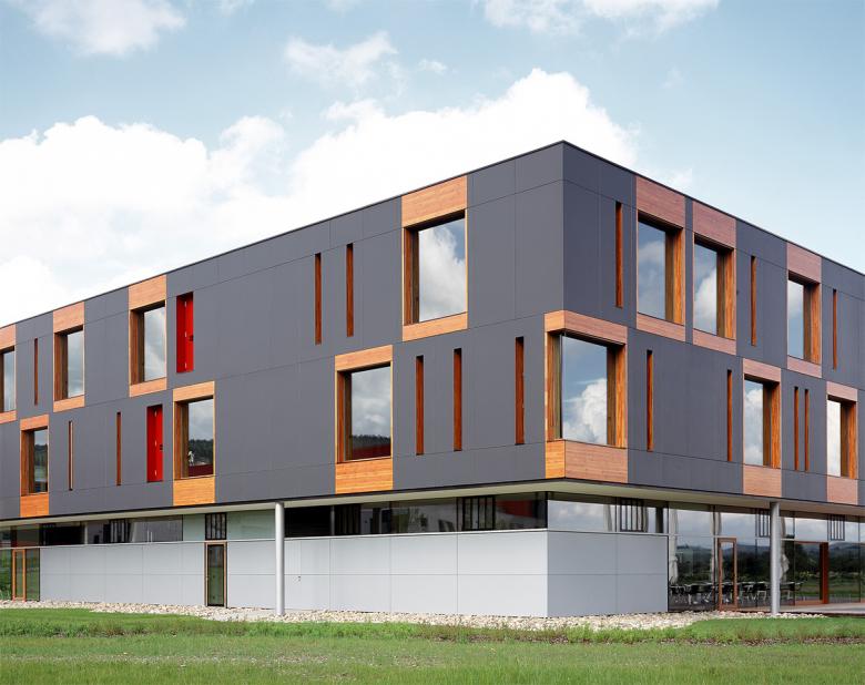 Die schwarzen Fassadentafeln aus Faserzement stehen in Kontrast zum gläsernen Sockel. In Zusammenarbeit mit Solares Bauen GmbH/Fraunhofer ISE wurden im Vorfeld für jede Himmelsrichtung separat das optimale Verhältnis von geschlossenen und verglasten Fassadenelementen festgelegt. Obwohl der Anteil der Glasflächen eine Bandbreite von 27 bis 52 Prozent hat, bietet die Fassade ein einheitliches Erscheinungsbild. Eine vorgefertigte, zweigeschossige Stahlkonstruktion, aufgelagert auf je zwei Stahl-Beton-Verbundstützen pro Seite, bildet das konstruktive Fassadengerüst.