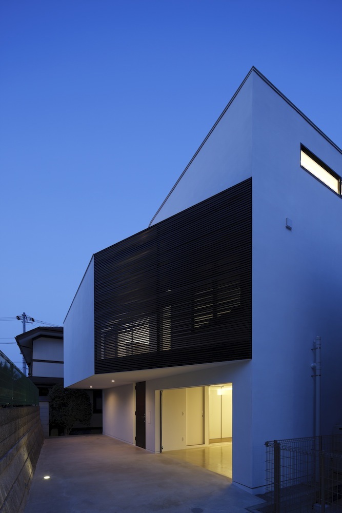 歯科医の御主人は奥様と二人の子供との生活を楽しむために、都心近郊の閑静な住宅地の一角を購入。旗竿敷地特有の細長い通路の奥にはキャンティバルコニーの格子が控えめな外観をつくり、一方、内部には木造2階建てとは思えないほどの開放的な大空間が広がっている。