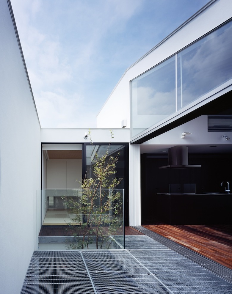 四方を隣家に囲われた都市部の旗竿敷地という一見ネガティブな環境だからこそ生まれる内外のコントラストは、家族や訪れる人々に心地良いサプライズを与えるに違いない。