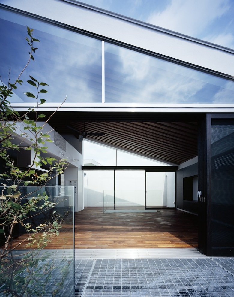 玄関前のピロティガレージに加え、玄関脇には愛車ポルシェ911を格納できるビルトインガレージを配置。廊下脇に設えたコンパクトなガラス張りの書斎からはショーケースに納まる愛車を眺めながら一時が過ごせる。ガレージ奥に設けた主寝室からは中庭が望め、上階に敷設されたグレーチング床を介して十分な朝日が注ぎ込む。