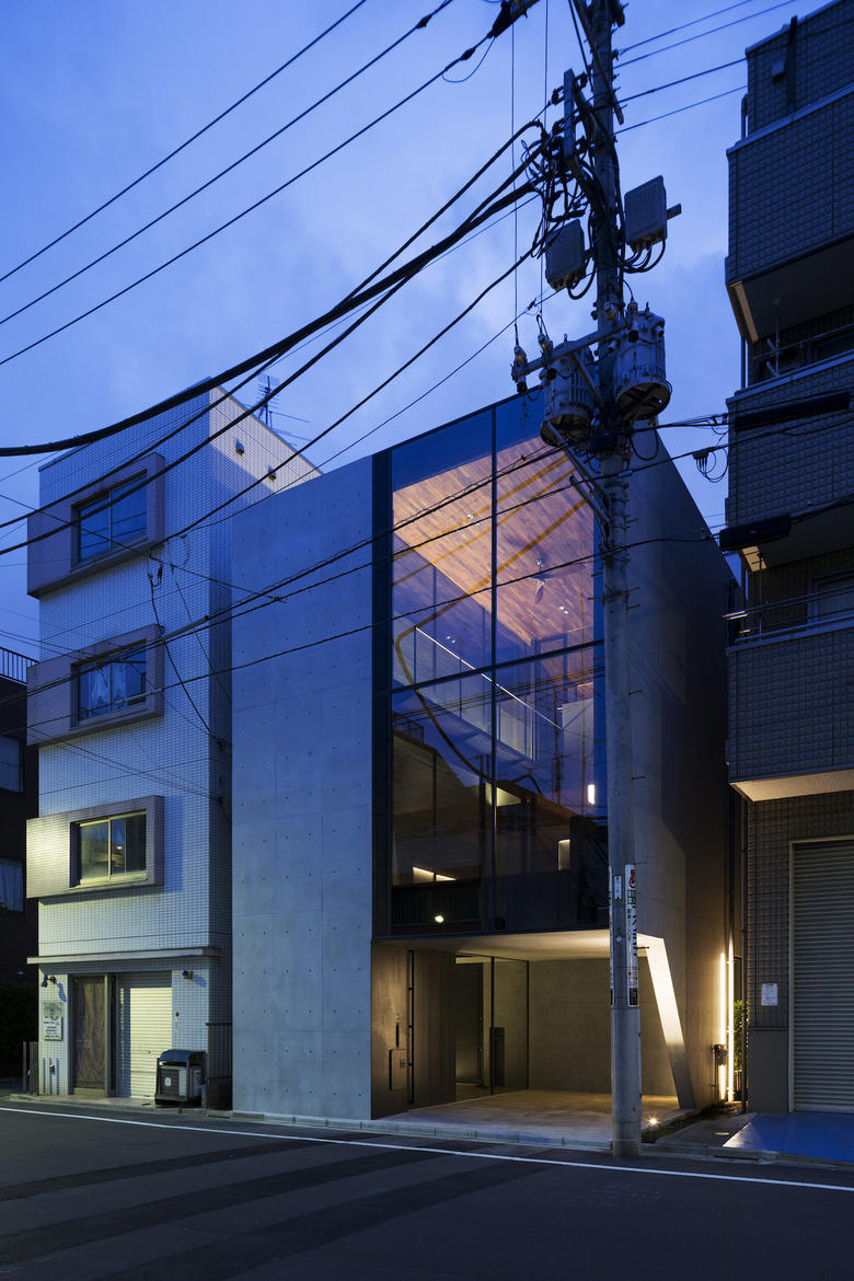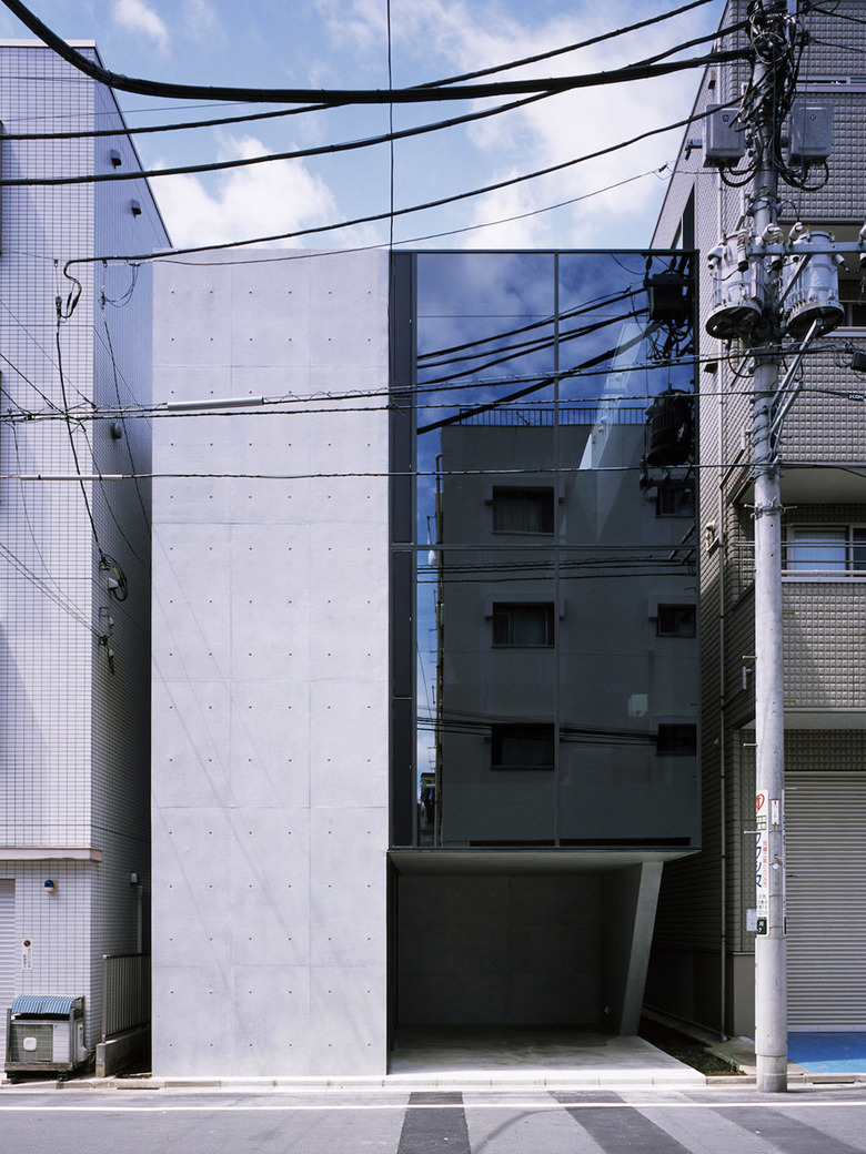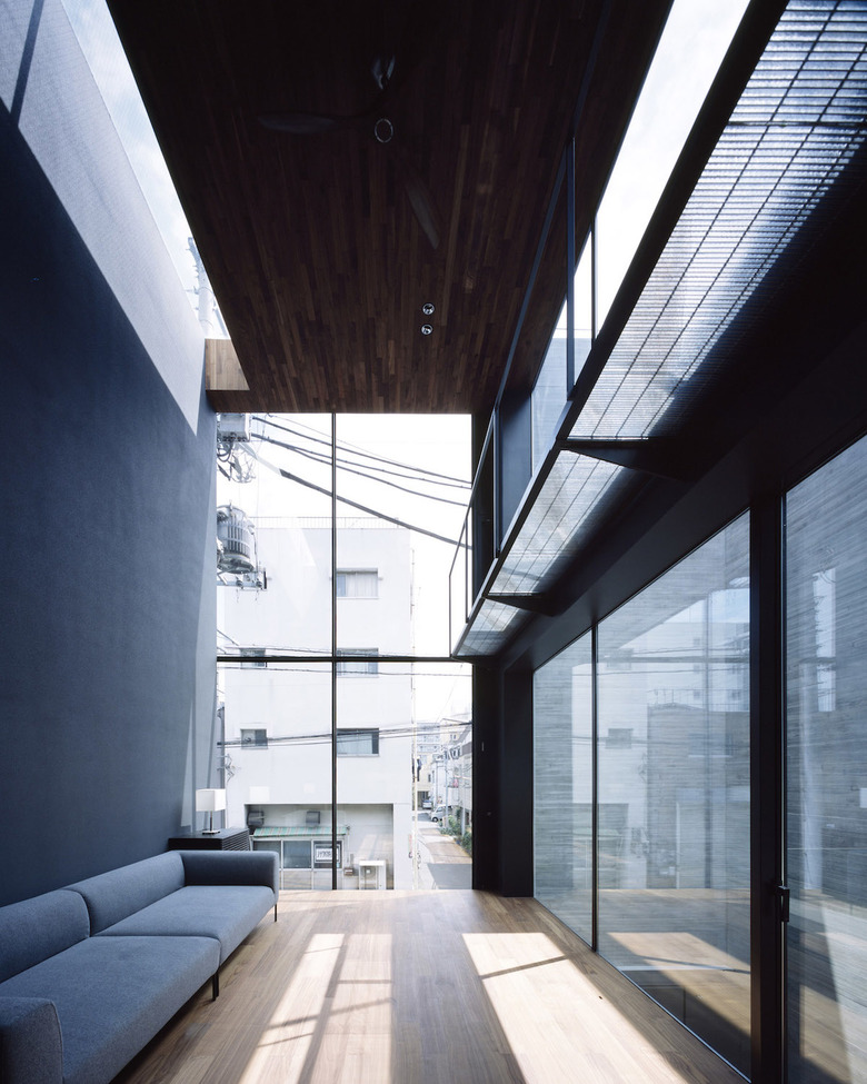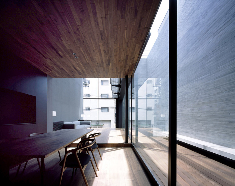 3階建ての建物は隣家3方に対してRC造の壁を立て、道路面のみ視界を開き、大型開口部はハーフミラーガラスにすることで、道路側の通行人の視界を遮る。東南側に吹き抜けを兼ねた中庭を設けることで、プライバシーを守りながらも光や風が感じられ、都市でもリゾート感を味わうことを可能にしている。