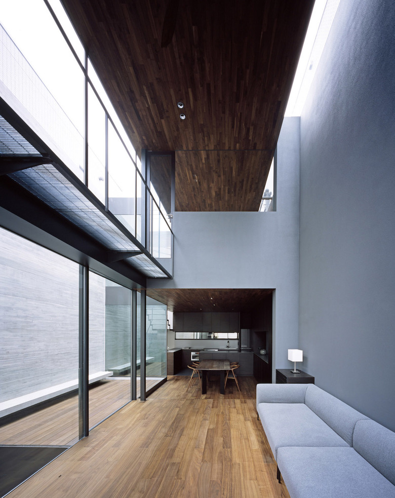 2階にある大きなワンルームのLDKは中庭に面しているため都会の中でもアウトドアライフが実現可能。天井の低いキッチンダイニングとは対照的に、二層吹き抜けのリビングと中庭が、トップライトの象徴的な光と戯れながらダイナミックに対峙している。