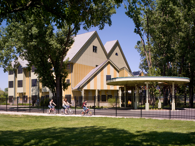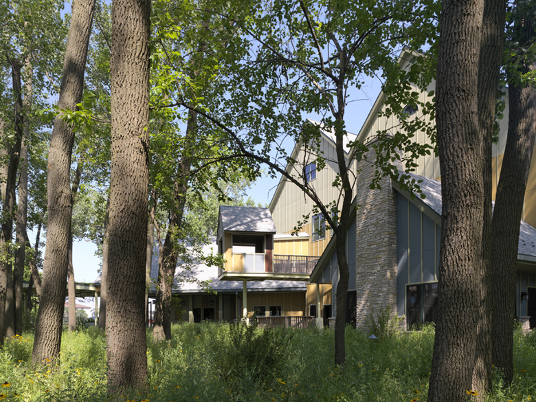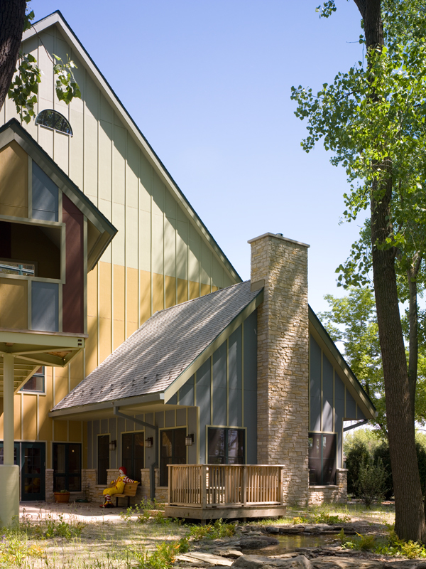Building a multifamily “home away from home” for families of seriously ill children demonstrates the importance of building a sense of community through support, socialization, and shared experience. The three-story house nestled in a grove of trees greets families upon arrival, expressing the essence of home.