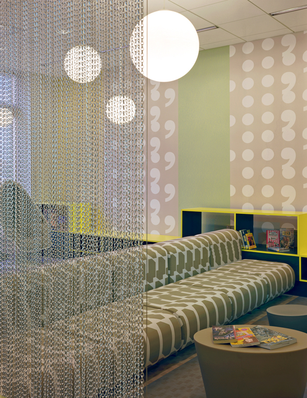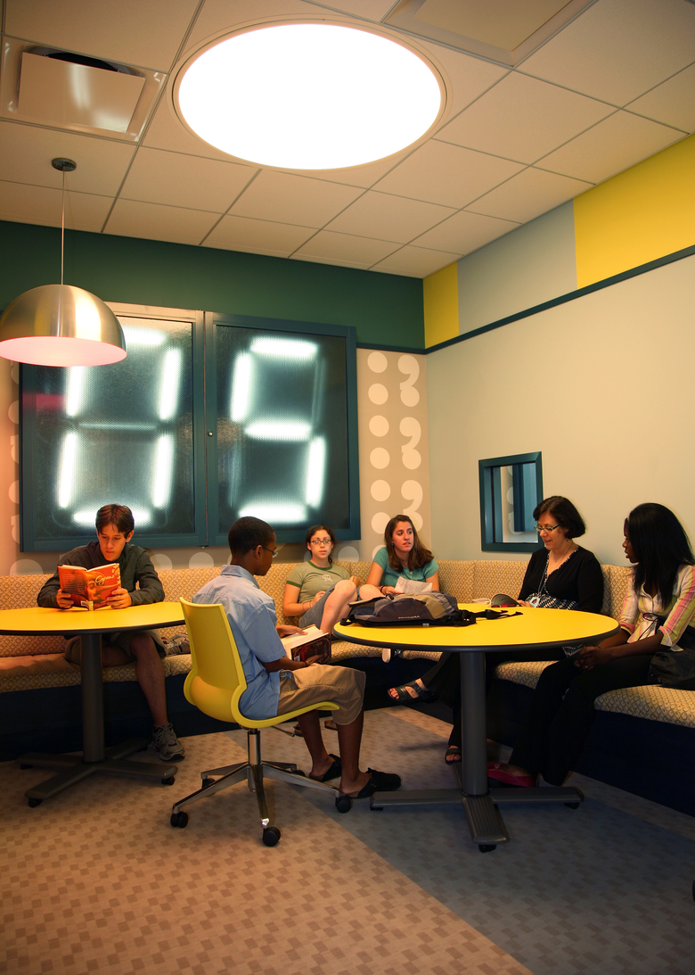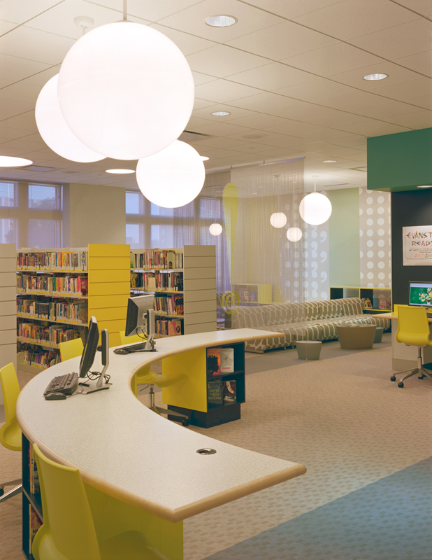 Illuminated digital letters set within a translucent honeycomb panel spell out ownership. A palette expressive of the teen’s sophisticated ideas evolved that represented duality: a “silly” side with an egg chair, mod lights, and spaces to lounge and a “serious” side with computers, study rooms, and task lighting. The pastiche of wallpapers speaks of encryption, perhaps indicative of teen communicative habits, inspired by both text and technology. The Reading Bar, a café-inspired counter surrounds the wall of monitors and informal stage that the teens or the teen librarian operate for improv poetry slams or performance. In its inaugural year, the Loft ran 274 programs and served over 1500 teens.
