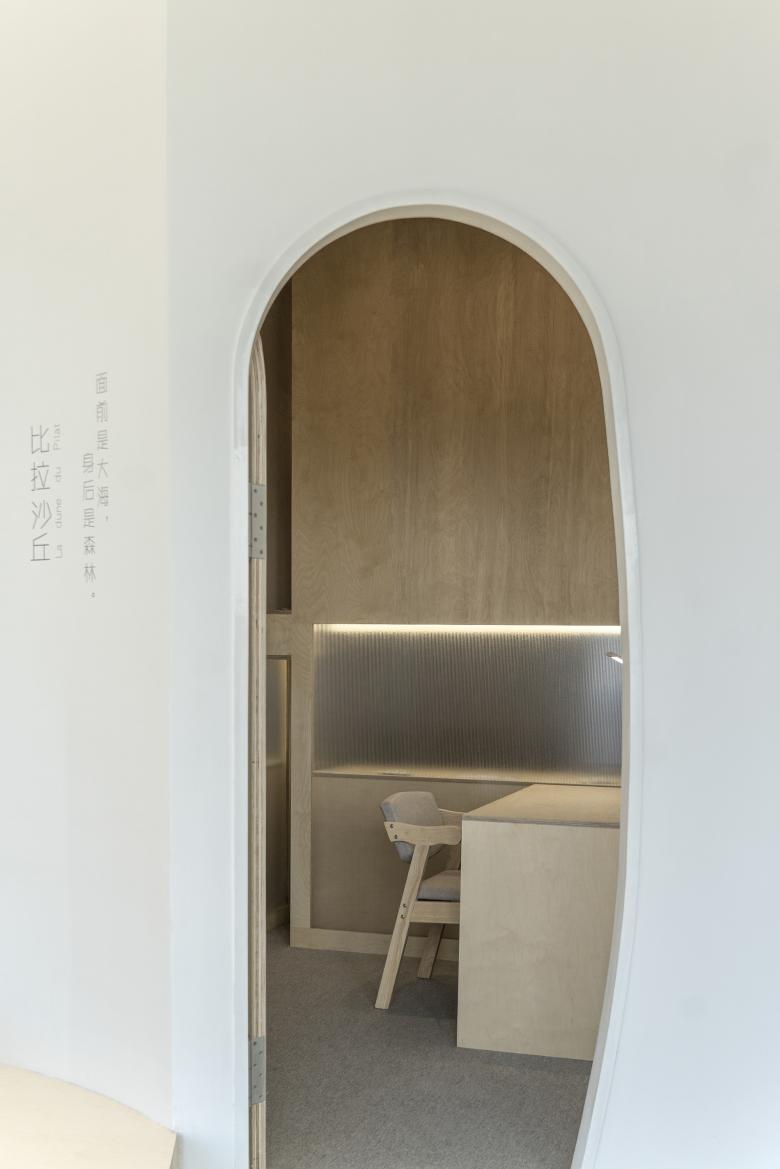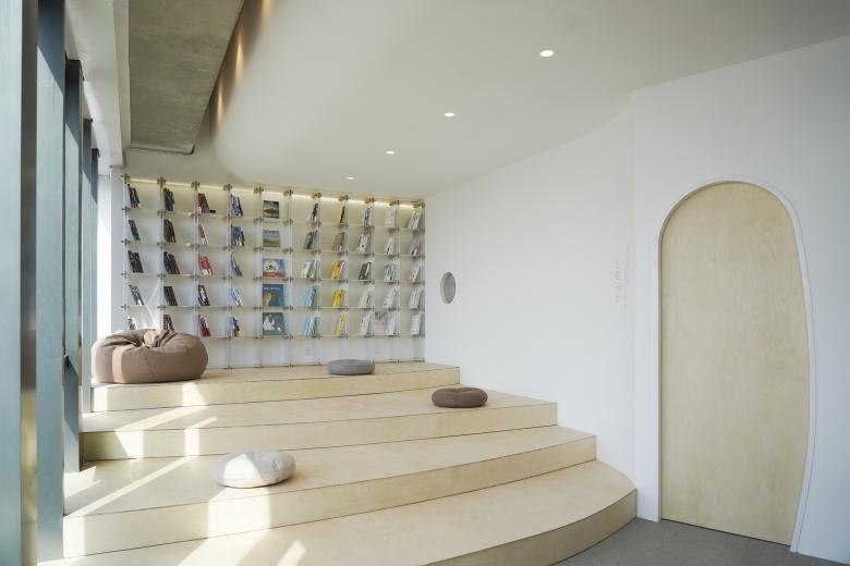 The wavy steps in front of the window are like rolling sand dunes, while the whole wall of bookshelves is like a forest waiting to be explored. The space along the windows on the west side is set for the leisure area, not only because it has the most beautiful scenery and the warmest sunset, but also considering the heat of the setting sun, it is not suitable for setting up seats for self-study, so the leisure area for short stay is the best choice. The small round hole on the partition wall between the leisure area and the self-study area is a little surprise designed for the self-study area. At a certain time, the setting sun will pass through the hole and shine into the self-study area, and the two separated spaces will share the beautiful moments of nature.
