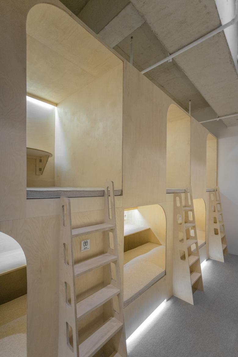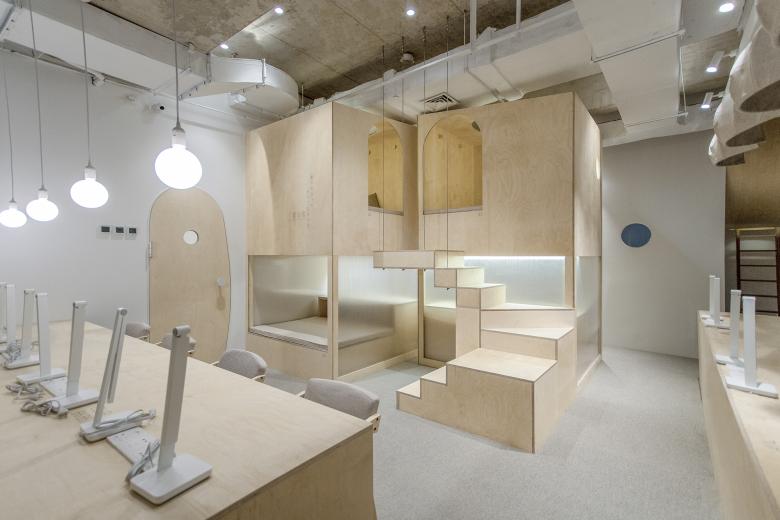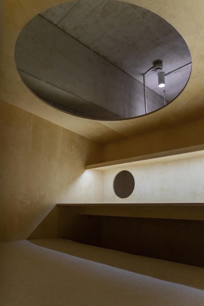 Mind wandering can be one of the ways to get rest. The “Bird's Nest” was created to add a resting place within a limited space. Taking advantage of the height of the building, we created a climbing space, which is accessed from the opening by a ladder, where you can either lie down and rest, or look out the window through a small hole in the side wall.