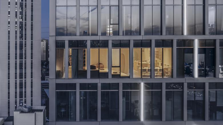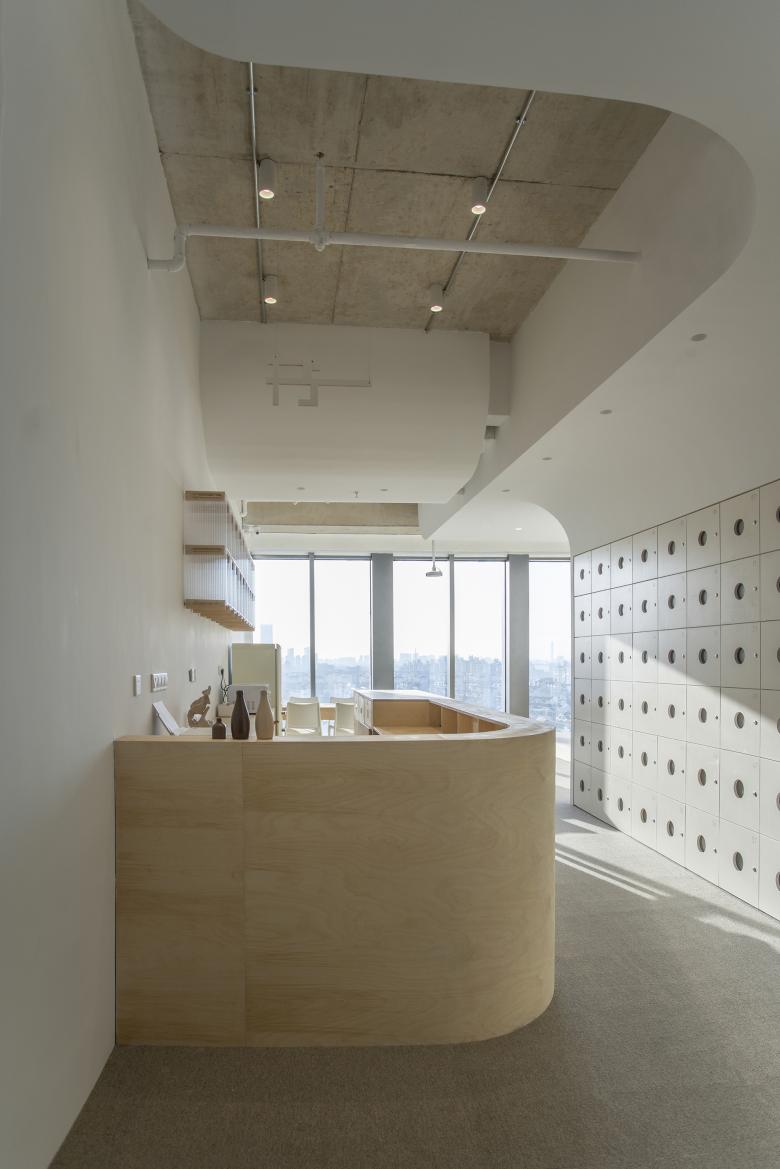 In the design of the entrance image, we intend to create a visual focus point at the end of the corridor, bringing a touch of warmth and softness to the office building. The gently undulating ceiling, conceals intricate pipes, which shows an image of neat and soft. The concrete floor slabs of the original building weave through the cloud-like ceiling, as if it were a gentle utopia that grew out of a reinforced concrete city.