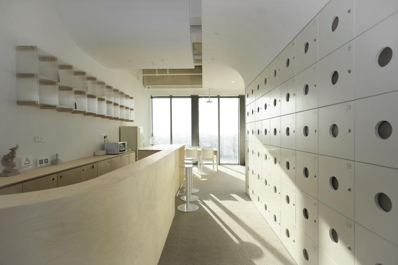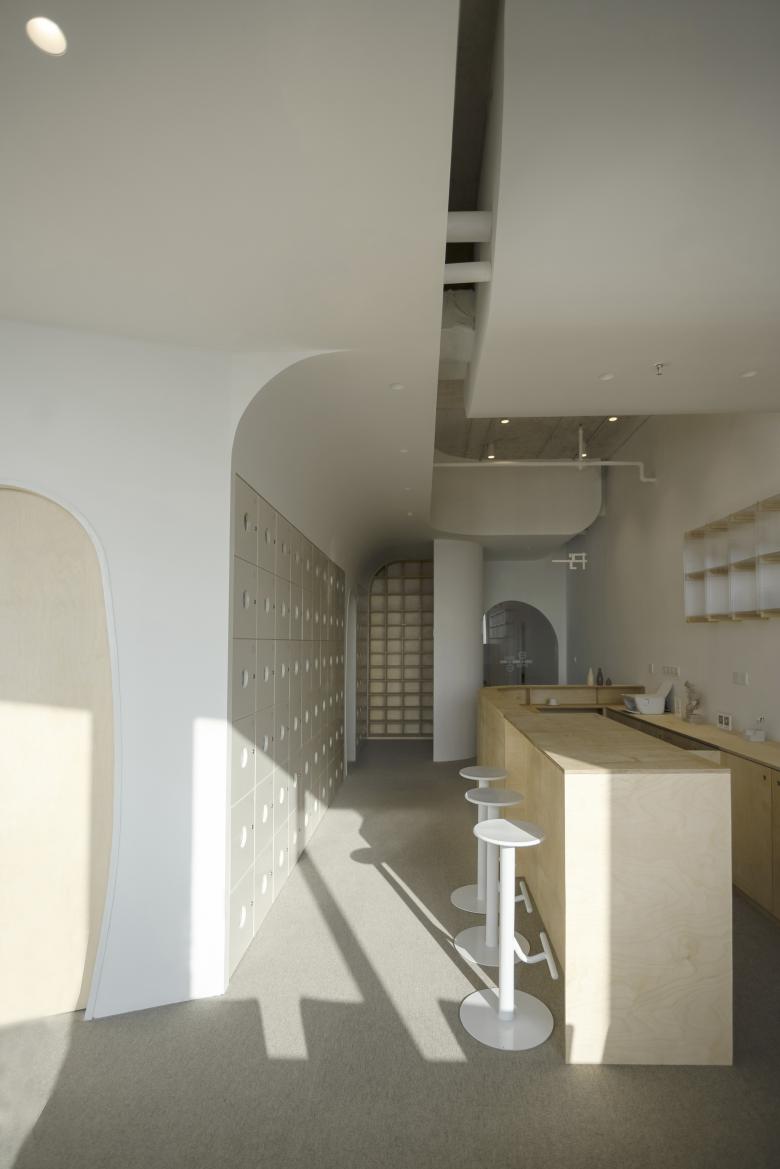 Atelier d’More was commissioned to design a self-study room for Bosuer as its first store opening in Shanghai, hoping to create a soft habitat in the city where struggling people can recharge. The project is located in the northwest corner of the 10th floor of Baolong Plaza office building in Qingpu, Shanghai. It is enclosed by floor-to-ceiling glass windows on the northwest and white walls on the southeast sides.